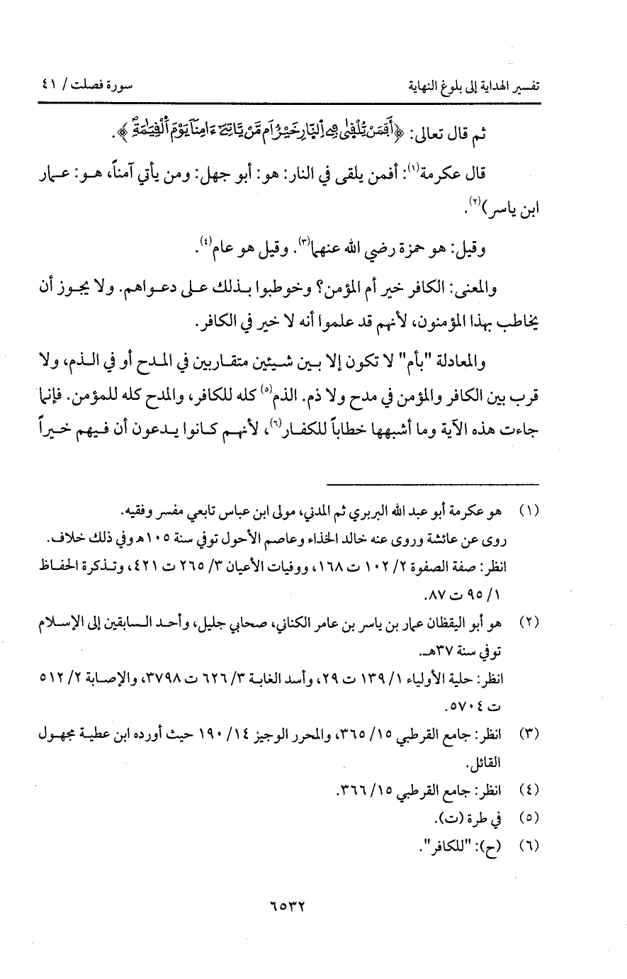 قال عكرمة: أفمن يلقى في النار: هو: أبو جهل: ومن يأتي آمناً، هو: عمار ابن ياسر).