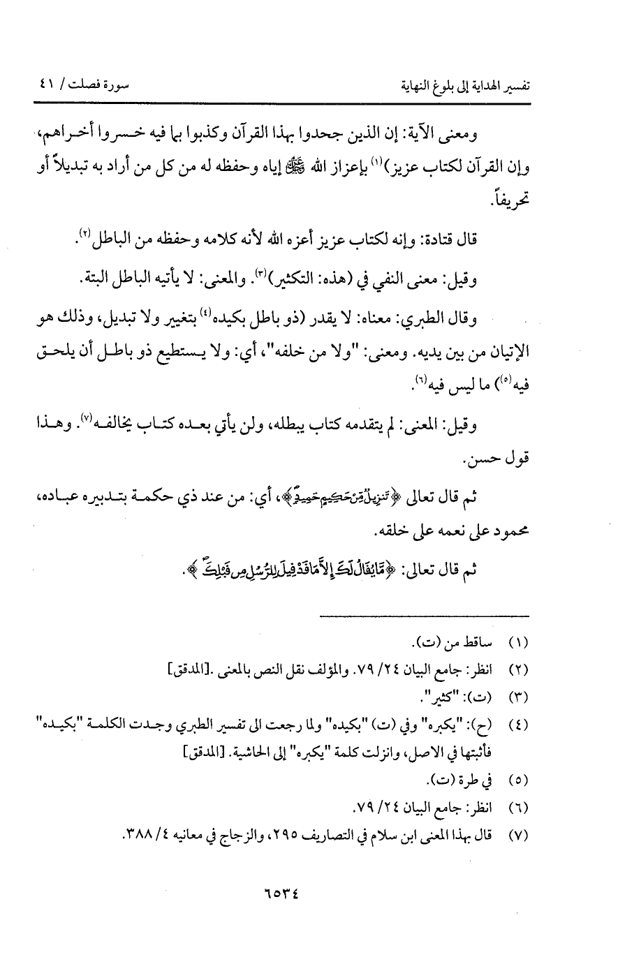 وقال الطبري: معناه: لا يقدر (ذو باطل بكيده بتغيير ولا تبديل، وذلك هو الإتيان من بين يديه. ومعنى: " ولا من خلفه "، أي: ولا يستطيع ذو باطل أن يلحق فيه) ما ليس فيه.