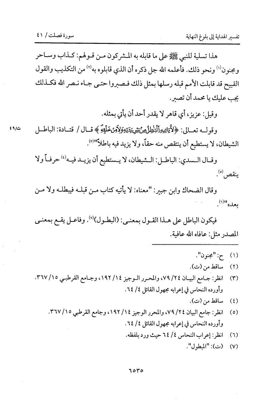 وقال السدي: الباطل: الشيطان، لا يستطيع أن ينتقص منه حقاً، ولا يزيد فيه باطلاً ".