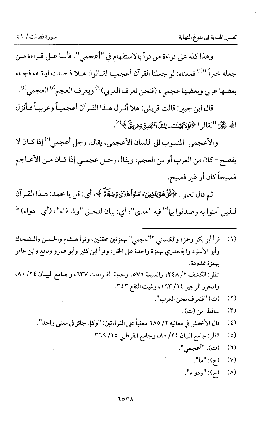 قال ابن جبير: قالت قريش: هلا أنزل هذا القرآن أعجمياً وعربياً فأنزل الله D " لقالوا {لَوْلاَ فُصِّلَتْ آيَاتُهُءَاعْجَمِيٌّ وَعَرَبِيٌّ}.
