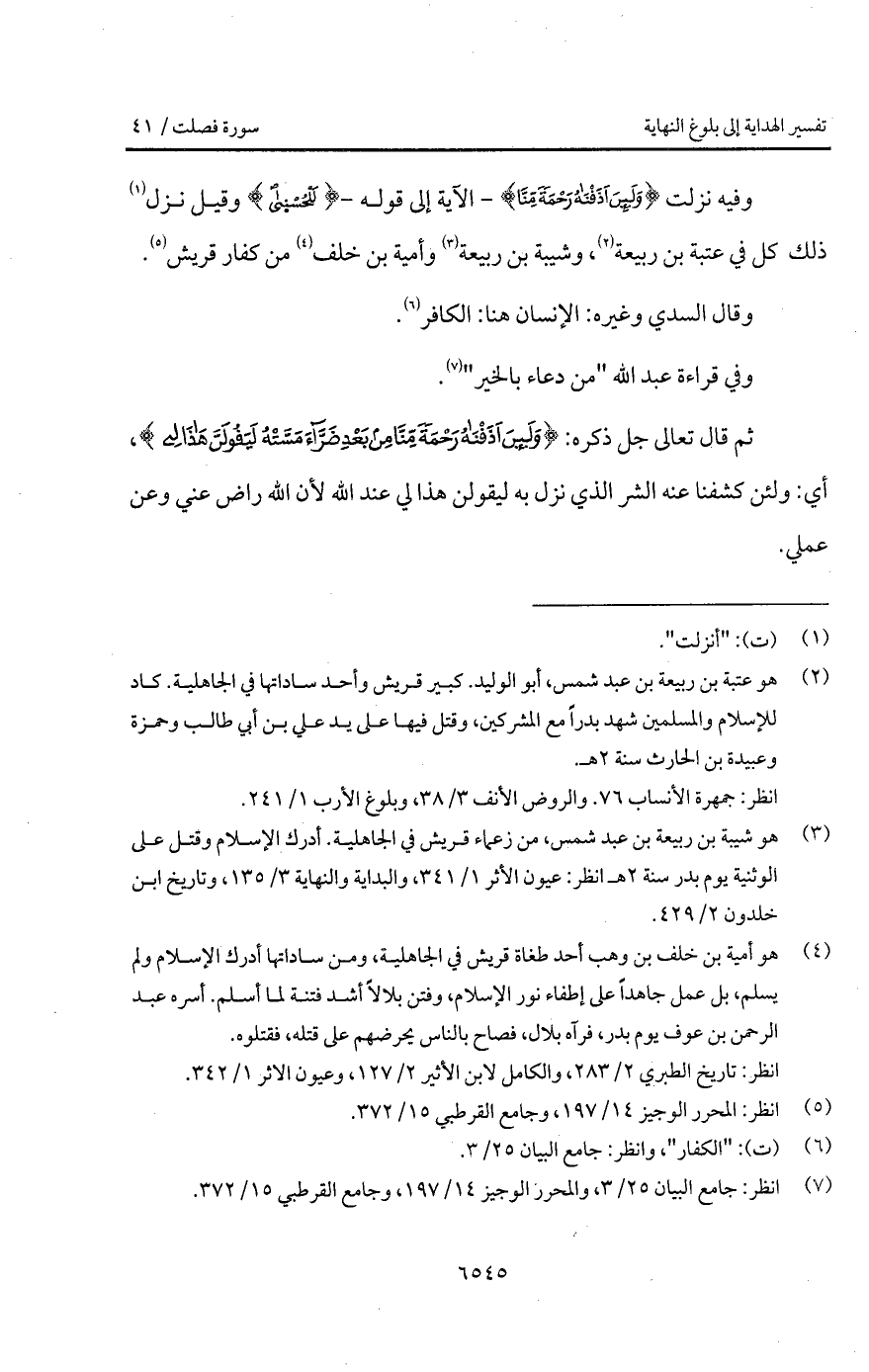 وفيه نزلت {وَلَئِنْ أَذَقْنَاهُ رَحْمَةً مِّنَّا} - الآية إلى قوله - {للحسنى} وقيل نزل ذلك كله في عتبة بن ربيعة، وشيبة بن ربيعة وأمية بن خلف من كفار قريش.