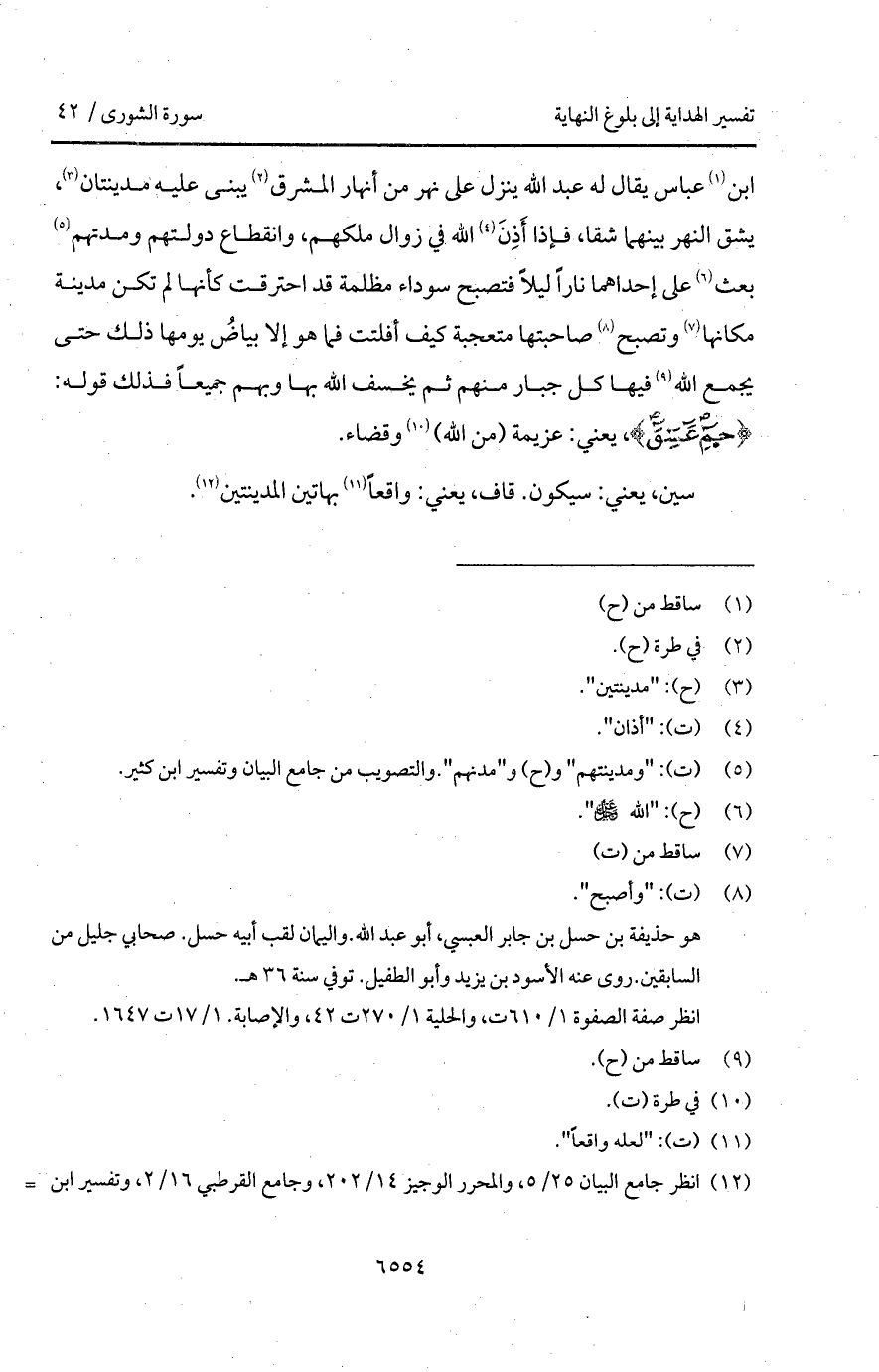 ابن عباس يقال له عبد الله ينزل على نهر من أنهار المشرق يبنى عليه مدينتان، يشق النهر بينهما شقا، فإذا أَذِنَ الله في زوال ملكهم، وانقطاع دولتهم ومدتهم بعث على إحداهما ناراً ليلاً فتصبح سوداء مظلمة قد احترقت كأنها لم تكن مدينة مكانها وتصبح صاحبتها متعجبة كيف أفلتت فما هو إلا بياضُ يومها ذلك حتى يجمع الله فيها كل جبار منهم ثم يخسف الله بها وبهم جميعاً فذلك قوله: {حم* عسق}، يعني: عزيمة (من الله) وقضاء.