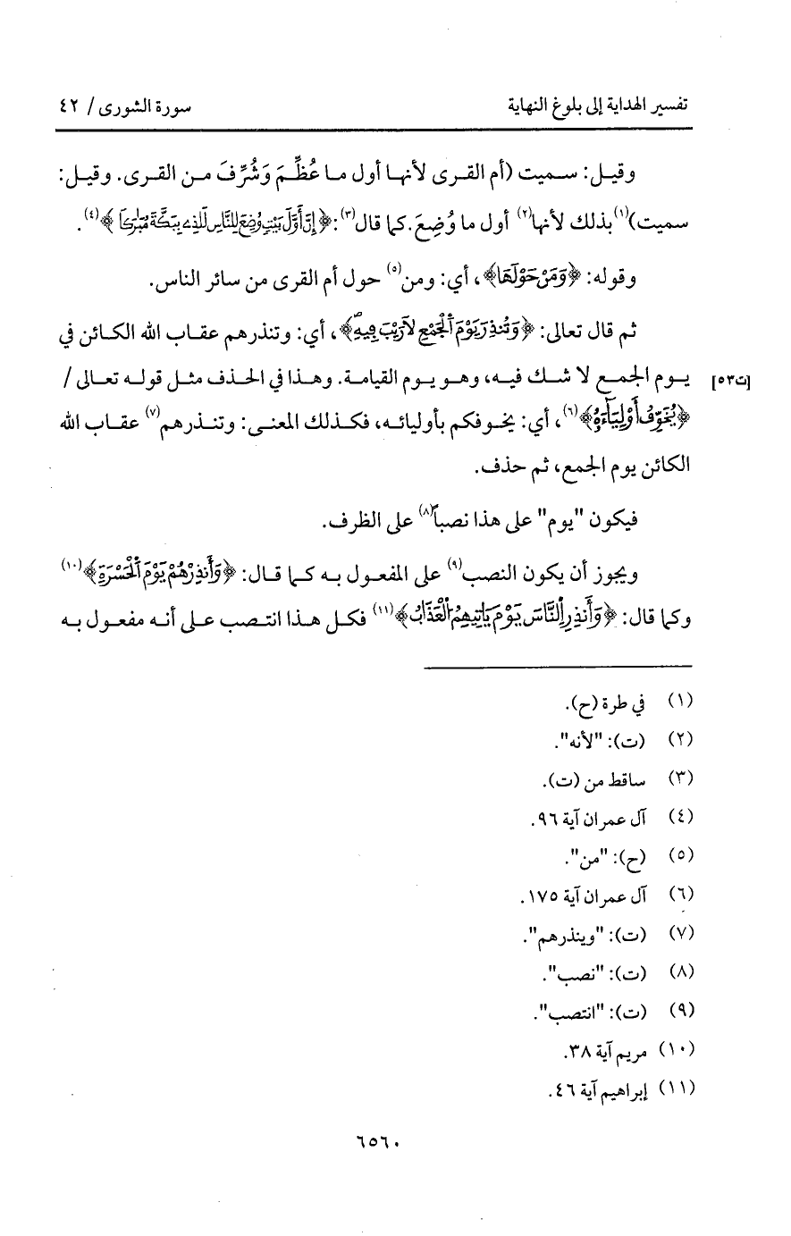ثم قال تعالى: {وَتُنذِرَ يَوْمَ الجمع لاَ رَيْبَ فِيهِ}، أي: وتنذرهم عقاب الله الكائن في يوم الجمع لا شك فيه، وهو يوم القيامة. وهذا في الحذف مثل قوله تعالى / {يُخَوِّفُ أَوْلِيَاءَهُ} [آل عمران: 175]، أي: يخوفكم بأوليائه، فكذلك المعنى: وتنذرهم عقاب الله الكائن يوم الجمع، ثم حذف.