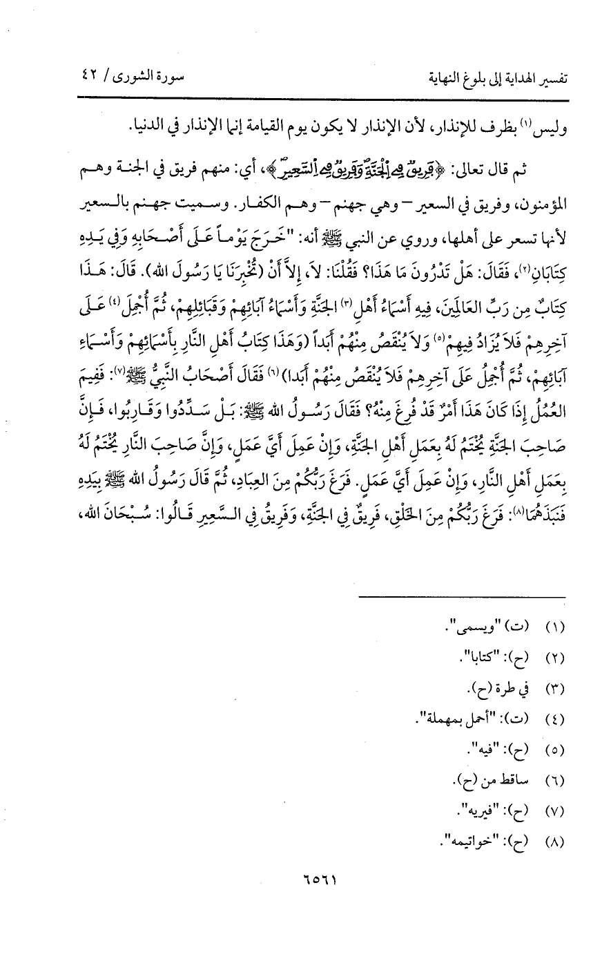 ثم قال تعالى: {فَرِيقٌ فِي الجنة وَفَرِيقٌ فِي السعير}، أي: منهم فريق في الجنة وهم المؤمنون، وفريق في السعير - وهي جهنم - وهم الكفار. وسميت جهنم بالسعير لأنها تسعر على أهلها. وروي عن النبي A أنه: " خَرَجَ يَوْماً عَلَى أَصْحَابِهِ وَفِي يَدِهِ كِتَابَانِ، فَقَالَ: هَلْ: تَدْرُونَ مَا هَذَا؟ فَقُلْنَا: لاَ، إِلاَّ اَنْ (تُخْبِرَنَا يَا رَسُولَ الله). قَالَ: هَذَا كِتَابٌ مِن رَبِّ العَالَمِينَ، فِيهِ أَسْمَاءُ أَهْلِ الجَنَّةِ وأَسْمَاءُ آبِائِهِمْ وَقَبَائِلِهِم، ثُمَّ أُجْمِلَ عَلَى آخِرِهِمْ فَلاَ يُزَادُ فِيهِم وَلاَ يُنْقَصُ مِنْهُمْ اَبَداً (وَهَذَا كِتَابُ أَهْلِ النَّارِ بِأَسْمِائِهِمْ وَأَسْمَاءِ أبَائِهِمْ، ثُمَّ أُجْمِلَ عَلَى آخِرِهِم فَلاَ يُنْقَصُ مِنْهُم أَبَداً) فَقَالَ أَصْحَابُ النَّبِيُّ A: فَفيمَ العُمُلُ إِذَا كَانَ هَذَا أَمْرٌ قَدْ فُرِغَ مِنْهُ؟ فَقَالَ رَسُولُ الله A: بَلْ سَدَّدُوا وَقَارِبُوا، فَإِنَّ صَاحِبَ الجَنَّةِ يُخْتَمُ لَهُ بِعَمَلِ أَهْلِ الجَنَّةِ، وَإِنْ عَمِلَ أَيَّ عَمضلٍ، وَإِنَّ صَاحِبَ النَّارِ يُخْتَمُ لَهُ بِعَمَلِ أَهْلِ النَّارِ، وَإِنْ عَمِلَ أَيَّ عَمَلٍ. فَرَغَ رَبُّكُمْ مِنَ العِبَادِ، ثُمَّ قَالَ رَسُولُ الله A بِيَدِهِ فَنَبَذَهُمَا. فَرَغَ رَبُّكُمْ مِنَ الخَلْقِ، فَرِيقٌ فِي الجَنَّةِ، وَفَرِيقُ فِي السَّعِيرِ قَالُوا: سُبْحَانَ الله،