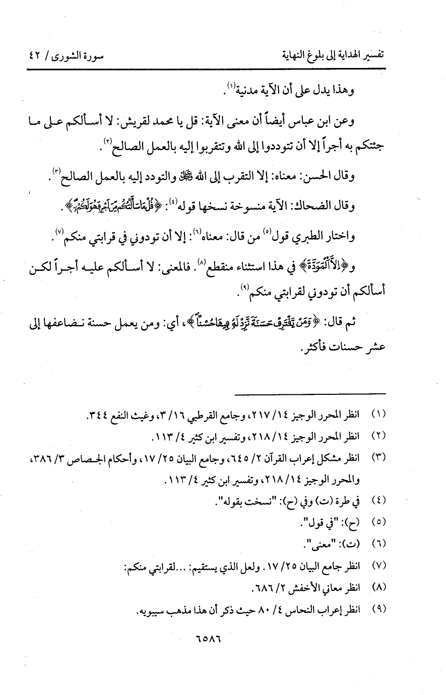 وعن ابن عباس أيضاً أن معنى الآية: قل يا محمد لقريش: لا أسألكم على ما جئتكم به أجراً إلا أن تتوددوا إلى الله وتتقربوا إليه بالعمل الصالح.