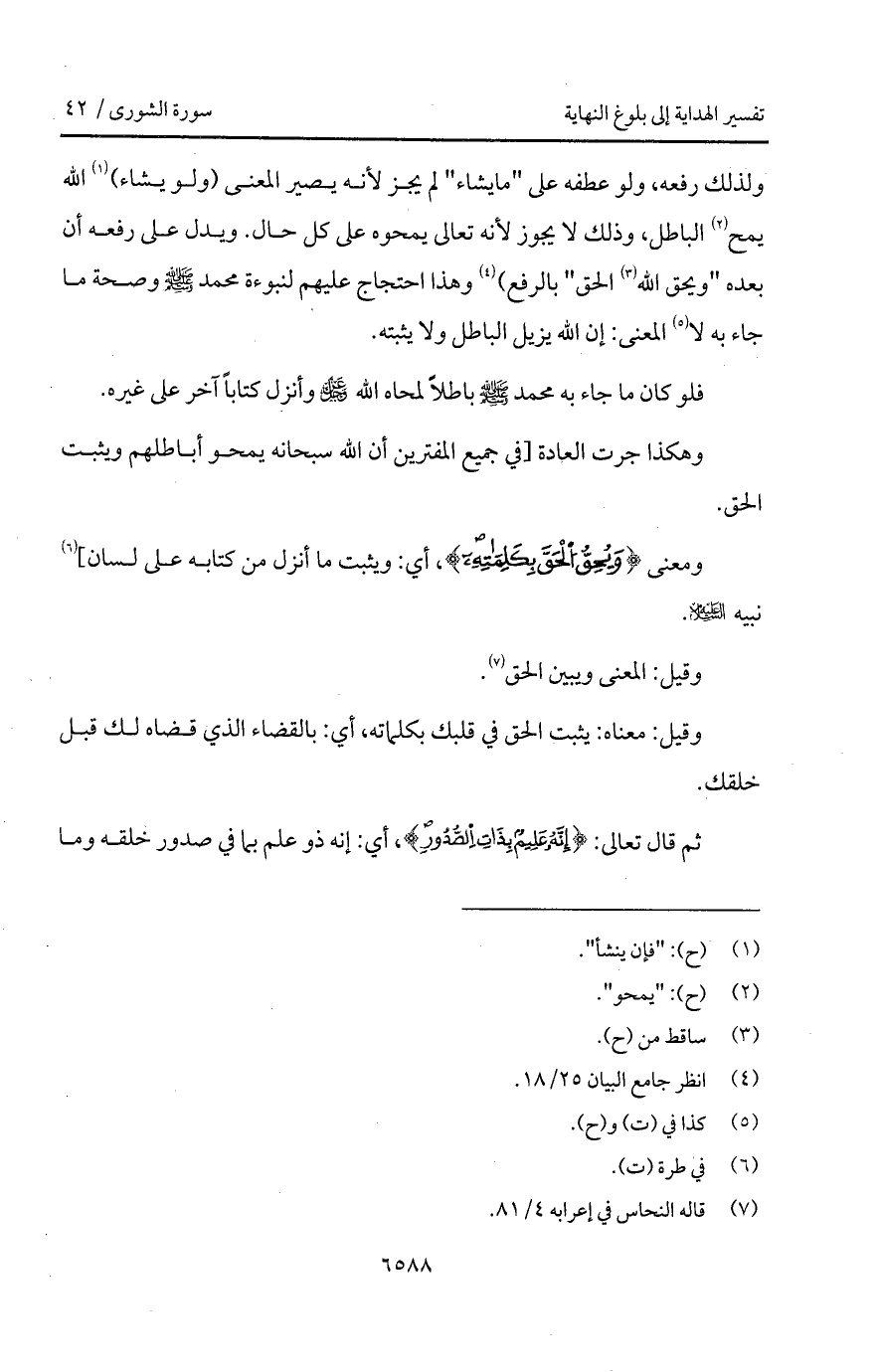 ولذلك رفعه، ولو عطفه على " ما يشاء " لم يجز لأنه يصير المعنى (ولو يشاء) الله يمح الباطل، وذلك لا يجوز لأنه تعالى يمحوه على كل حال. ويدل على رفعه أن بعده " ويحق الله الحق " بالرفع) وهذا احتجاج عليهم لنبوءة وصحة ما جاء به لا المعنى: إن الله يزيل الباطل ولا يثبته.