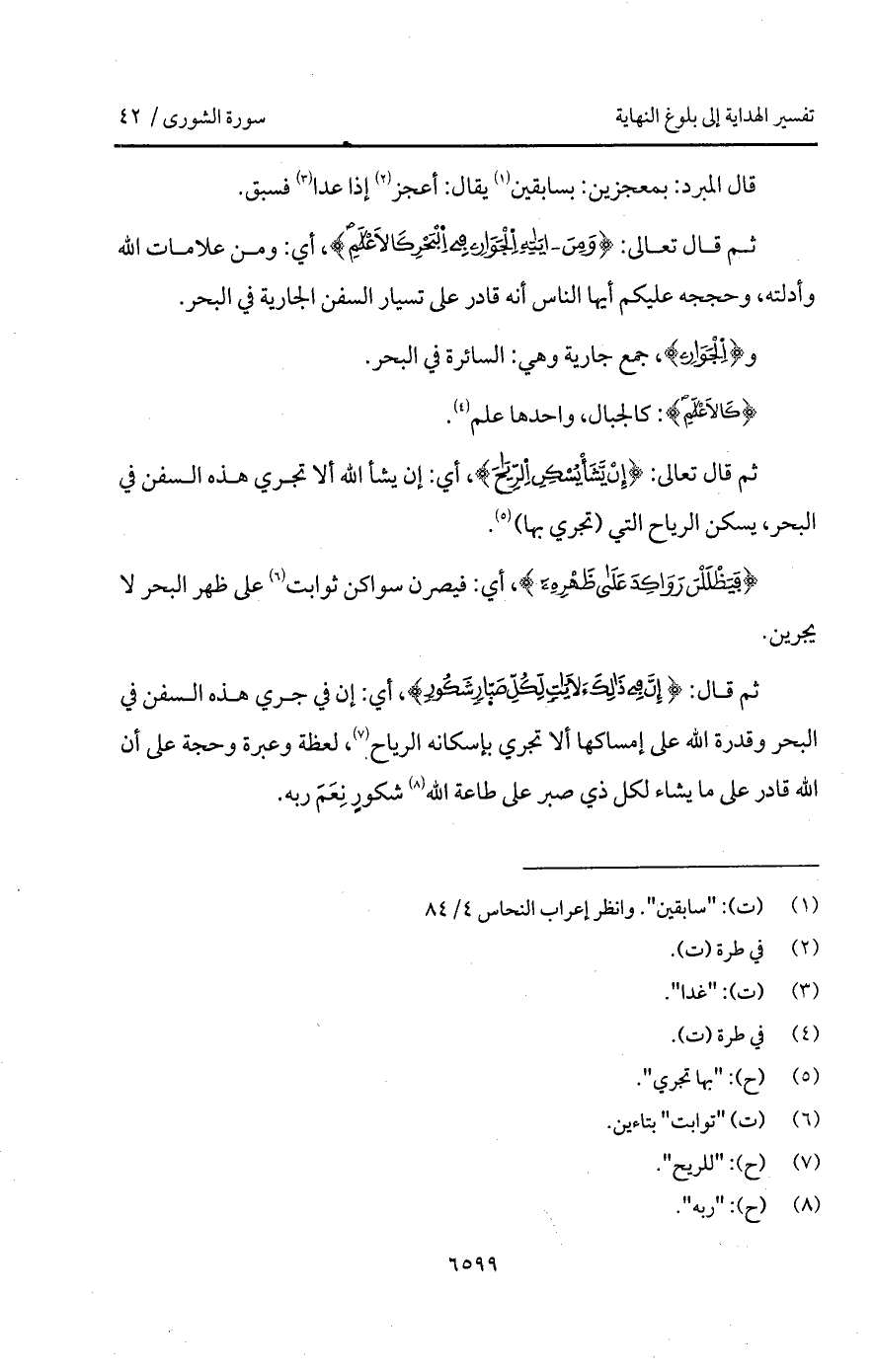 ثم قال تعالى: {وَمِنْ آيَاتِهِ الجوار فِي البحر كالأعلام}، أي: ومن علامات الله وأدلته، وحججه عليكم أيها الناس أنه قادر على تسيار السفن الجارية في البحر.