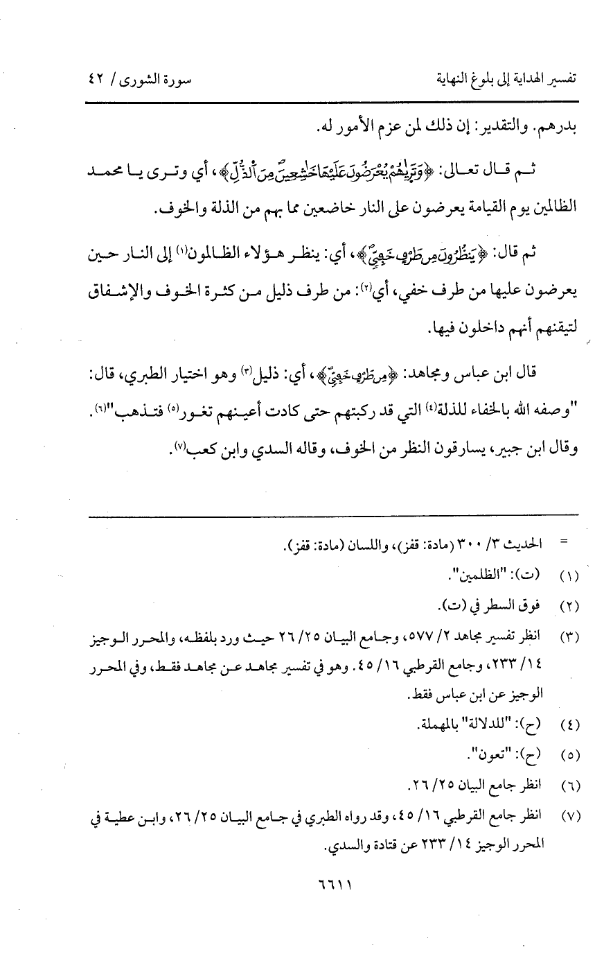 ثم قال: {يَنظُرُونَ مِن طَرْفٍ خَفِيٍّ}، أي: ينظر هؤلاء الظالمون إلى النار حين يعرضون عليها من طرفي خفي، أي: من طرف ذليل من كثرة الخوف والإشفاق لتبقيهم أنهم داخلون فيها.