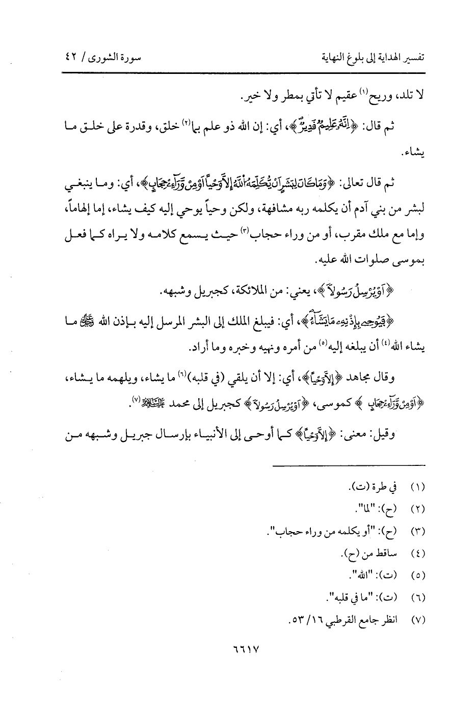 وقال مجاهد {إِلاَّ وَحْياً}، أي: إلا أن يلقي (في قلبه) ما يشاء، ويلهمه ما يشاء، {أَوْ مِن وَرَآءِ حِجَابٍ} كموسى، {أَوْ يُرْسِلَ رَسُولاً} كجبريل إلى محمد عليهما السلام.