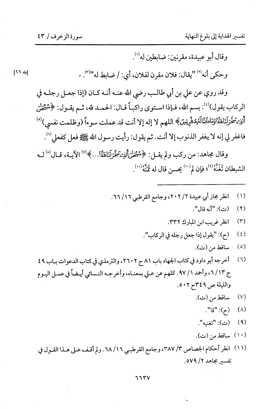 وقد روي عن علي بم أبي طالب Bهـ أنه كان (إذا جعل رجله في الركاب يقول): بسم الله، فإذا استوى راكباً قال: الحمد لله، ثم يقول: {سُبْحَانَ الذي سَخَّرَ لَنَا هذا وَمَا كُنَّا لَهُ مُقْرِنِينَ} اللهم لا إله إلا أنت قد عملت سوءاً (وظلمت نفسي) فاغفر لي إنه لا يغفر الذنوب إلا أنت.
