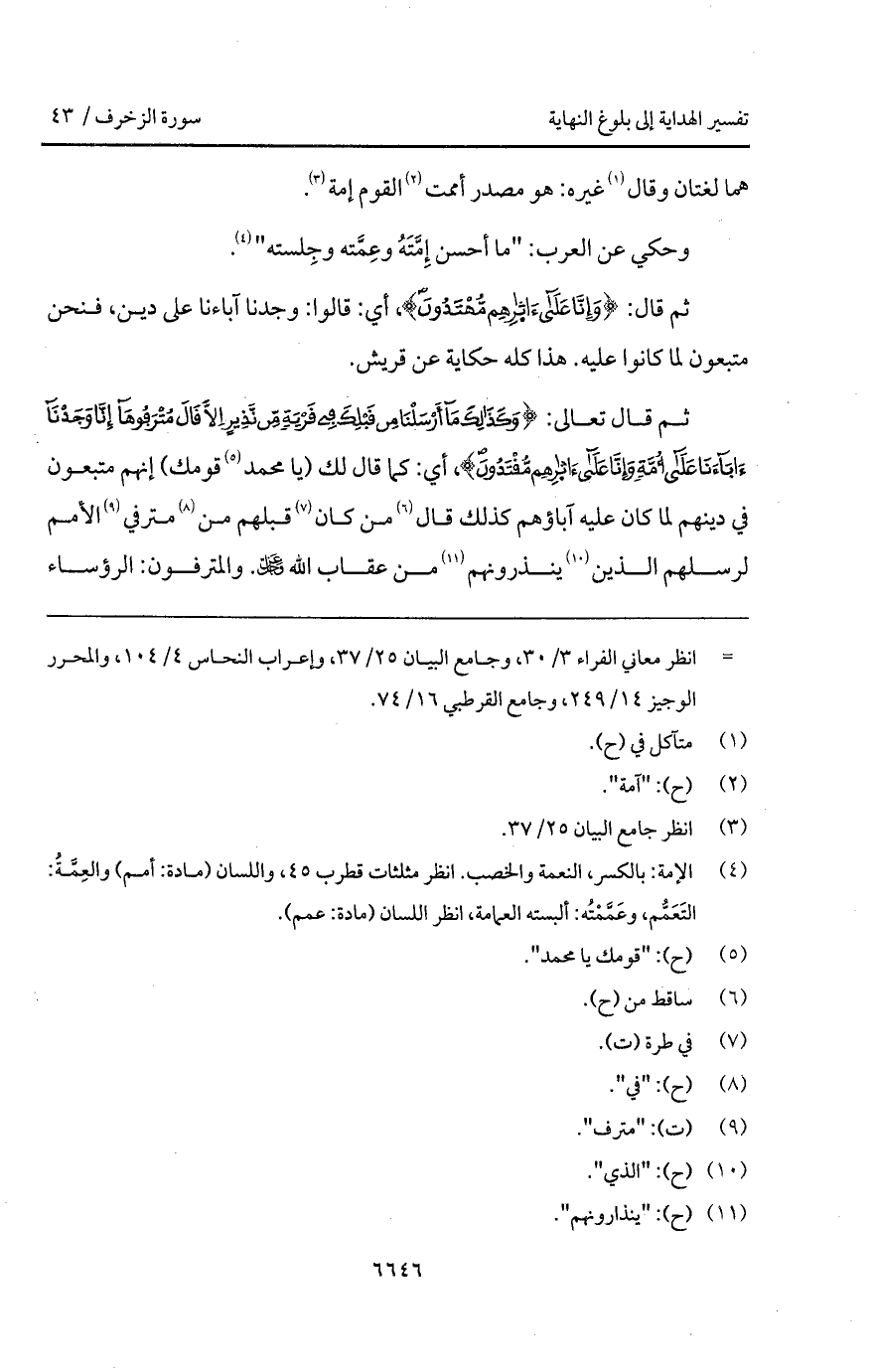 ثم قال تعالى: {وَكَذَلِكَ مَآ أَرْسَلْنَا مِن قَبْلِكَ فِي قَرْيَةٍ مِّن نَّذِيرٍ إِلاَّ قَالَ مُتْرَفُوهَآ إِنَّا وَجَدْنَآءَابَآءَنَا على أُمَّةٍ وَإِنَّا علىءَاثَارِهِم مُّقْتَدُونَ}، أي: كما قال لك (يا محمد قومك) إنهم متبعون في دينهم لما كان عليه آباؤهم كذلك قال من كان قبلهم من مترفي الأمم لرسلهم الذين ينذرونهم من عقاب الله D. والمترفون: الرؤساء