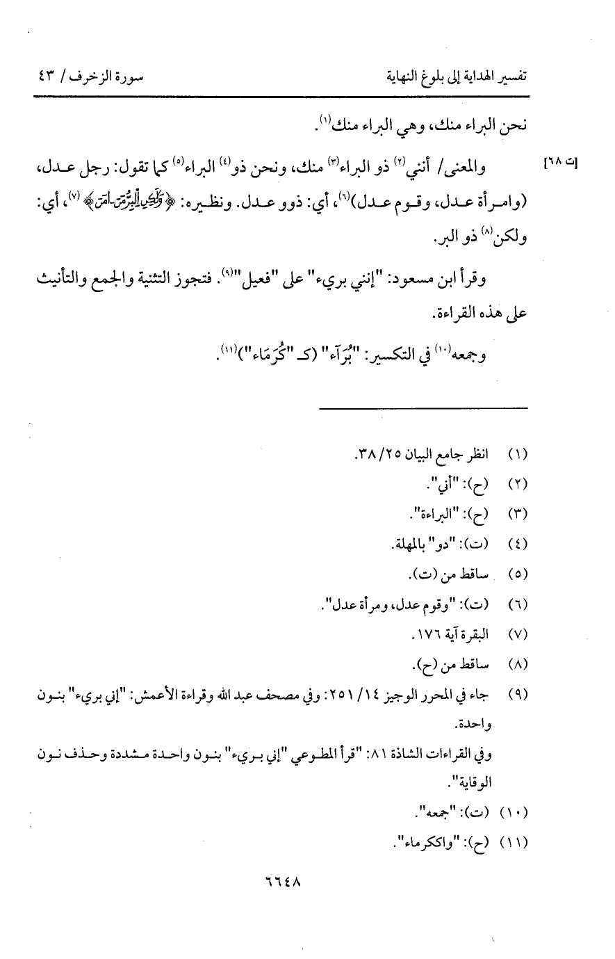 والمعنى / أنني ذو البراء منك، ونحن ذو البراء كما تقول: رجل عدل، (وامرأة عدل، وقوم عدل)، أي: ذوو عدل. ونظيره: {ولكن البر مَنْ آمَنَ} [البقرة: 177]، أي: ولكن ذو البر.