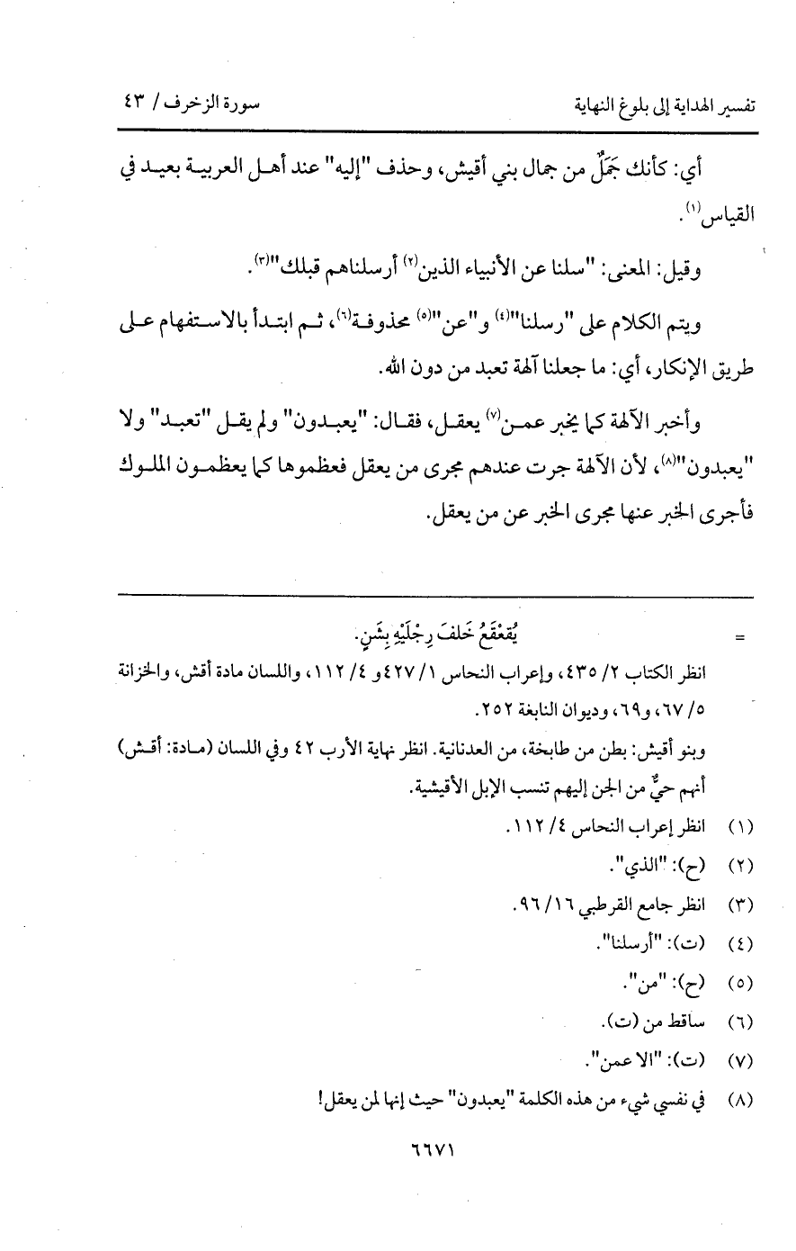 أي: كأنك جَمَلٌ من جمال بني أقيش، وحذف " إليه " عند أهل العربية بعيد في القياس.
