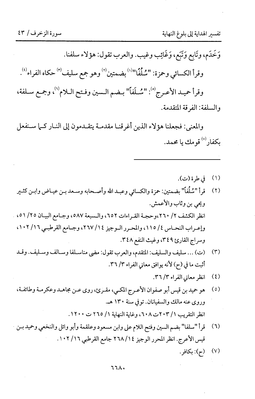 وقرأ الكسائي وحمزة: " سُلُفًا " بضمتين وهو جمع سليف حكاه الفراء.