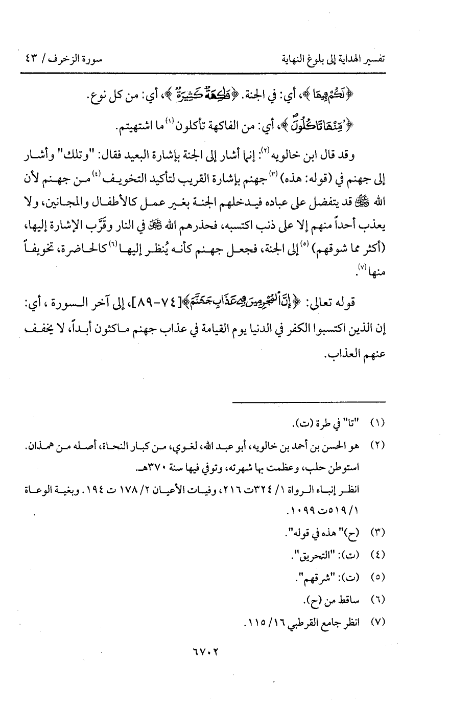 وقد قال ابن خالويه: إنما أشار إلى الجنة بإِارة البعيد فقال: " وتلك " وأشار إلى جهنم في (قوله: هذه) جهنم بإشارة القريب لتأكيد التخويف من جهنم لأن الله D قد يتفضل على عباده فيدخلهم الجنة بغير عمل كالأطفال والمجانين، ولا يعذب الله D قد يتفضل على عباده فيدخلهم الجنة بغير عمل كالأطفال والمجانين، ولا يعذب أحد منهم إلى على ذنب اكتسبه، فحذرهم الله D في النار وقَرَّب الإشارة إليها، (أكثر مما شوقهم) إلى الجنة، فجعل جهنم كأنه يُنظر إليها كالحاضرة، تخويفاً منها.