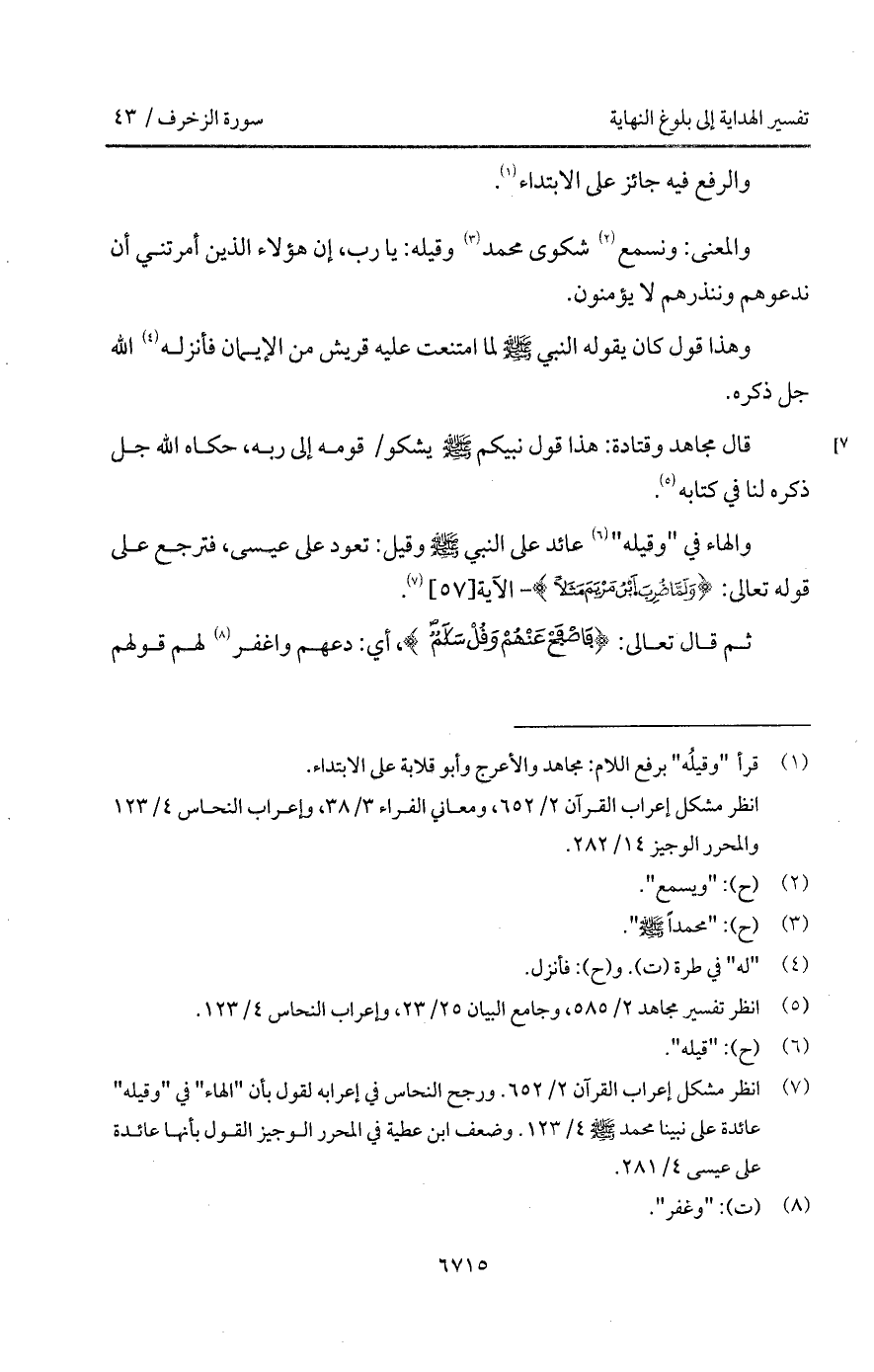 والهاء في " وقيله " عائد على النبي A وقيل: تعود على عيسى، فترجع على قوله تعالى: {وَلَمَّا ضُرِبَ ابن مَرْيَمَ مَثَلاً} [الزخرف: 57]- الآية.