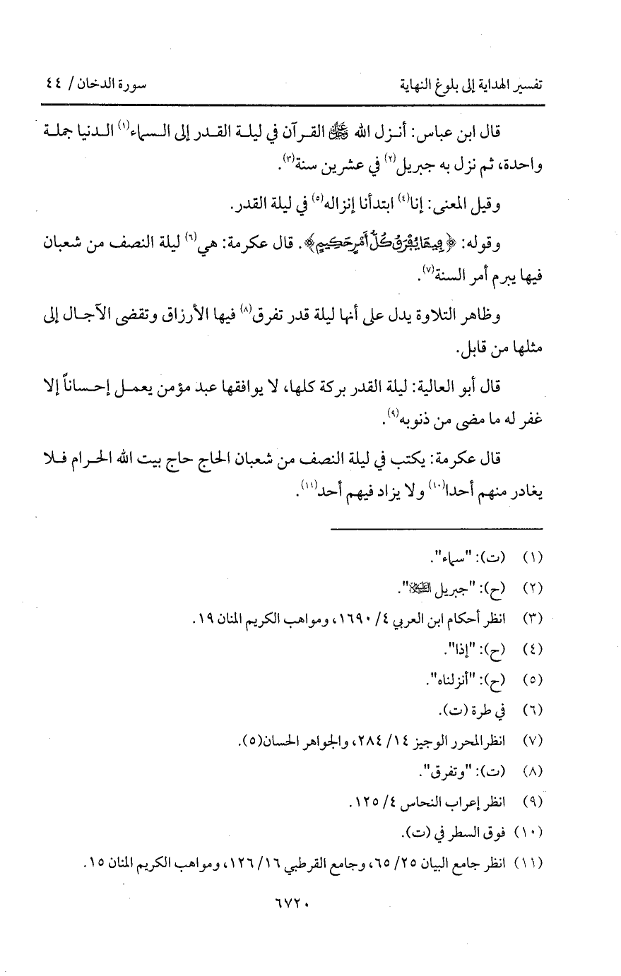 قال ابن عباس: أنزل الله D القرآن في ليلة القدر إلى السماء الدنيا جملة واحدة، ثم نزل به جبريل في عشرين سنة.
