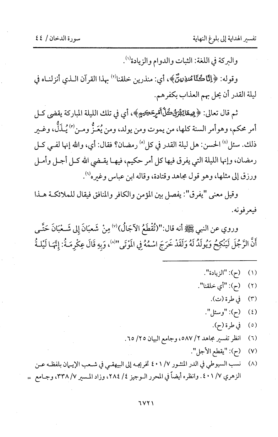 ثم قال تعالى: {فِيهَا يُفْرَقُ كُلُّ أَمْرٍ حَكِيمٍ}، أي في تلك الليلة المباركة يقضى كل أمر محكم، وهو أمر السنة كلها، من يموت ومن يولد، ومن يُعَزُّ ومن يُذَلُّ، وغير ذلك. سئل الحسن: هل ليلة القدر في كل رمضان؟ فقال: أي، والله إنها لفي كل رمضان، سئل الحسن: هل ليلة القدر في كل رمضان؟ فقال: أي، والله إنها لفي كل رمضان، وإنها الليلة التي يفرق فيها كل أمر حكيم، فيها يقضي الله كل أجل وأمل ورزق إلى مثلها، وهو قول مجاهد وقتادة، وقاله ابن عباس وغيره.