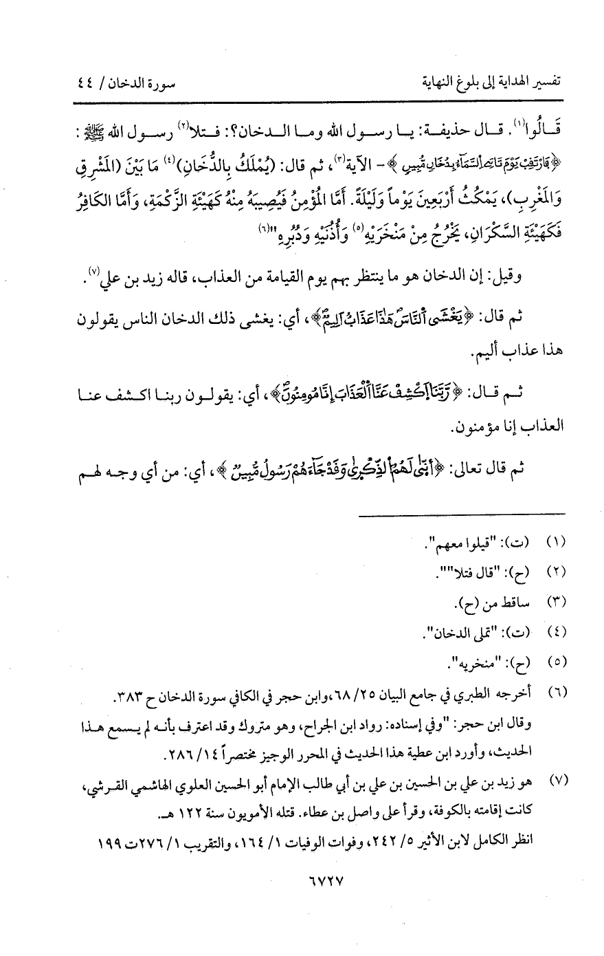 قَالُوا. قال حذيفة: يا رسول الله وما الدخان؟: فتلا رسول الله A: { فارتقب يَوْمَ تَأْتِي السمآء بِدُخَانٍ مُّبِينٍ} - الآية، ثم قال: (يُمْلَكُ بِالدُّهَانِ) مَا بَيْنَ (المَشْرِقِ وَالمَغْرِبِ)، يَمْكُثُ أَرْبَعِينَ يَوْماً وَلَيْلَةً. أَمَّا المُؤْمِنُ فَيُصِيبَهُ مِنْهُ كَهَيْئَةِ الزَّكْمَةِ، وَأَمَّا الكَافِرُ فَكَهَيْئَةِ السَّكْرَانِ، يَخْرُجُ مِنْ مَنْخَرَيْهِ وَأُذُنَيْهِ وَدُبُرِهِ ".
