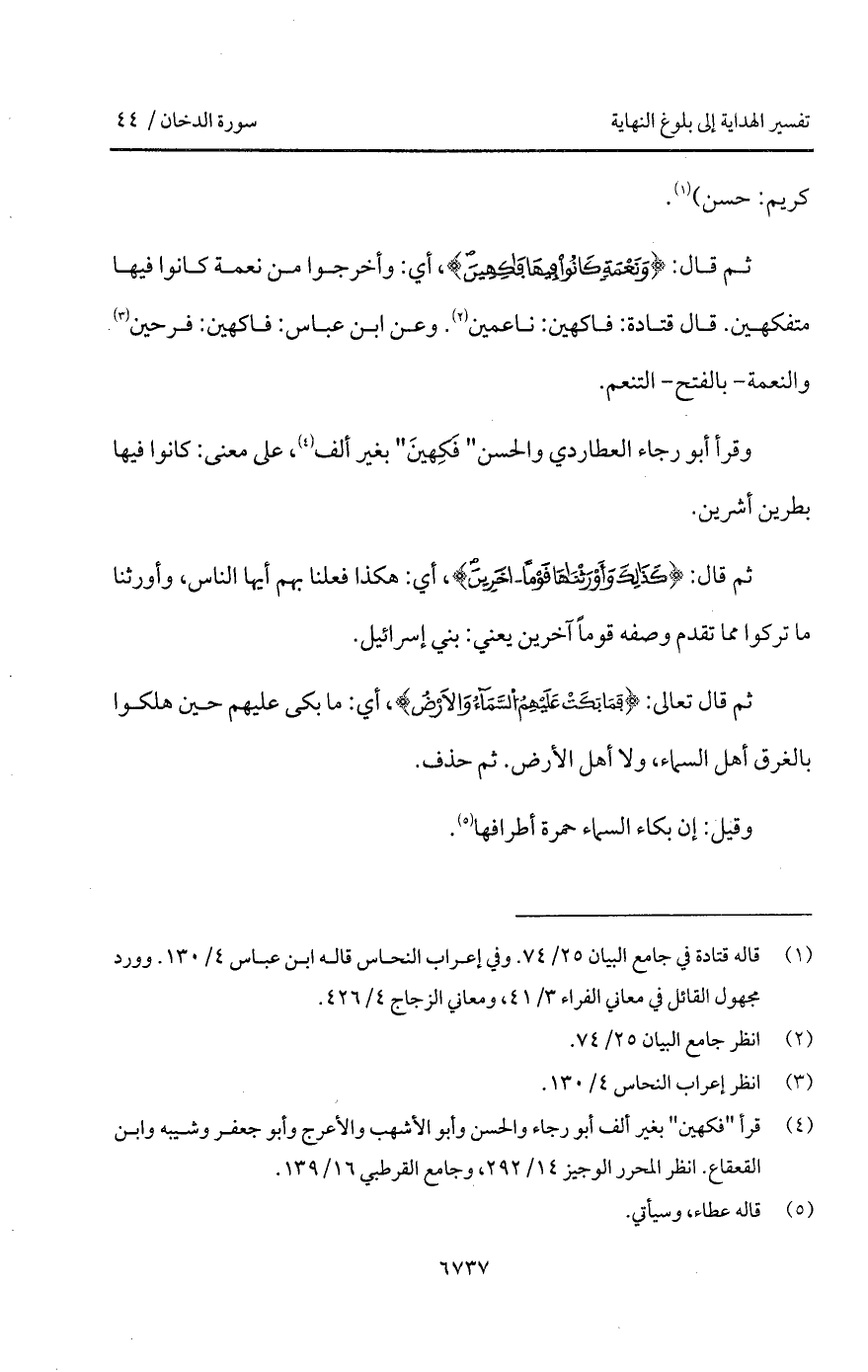 ثم قال: {وَنَعْمَةٍ كَانُواْ فِيهَا فَاكِهِينَ}، أي: وأخرجوا من نعمة كانوا فيها متفكهين. قال قتادة: فاكهين: ناعمين. وعن ابن عباس: فاكهين: فرحين والنعمة - بالفتح - التنعم.