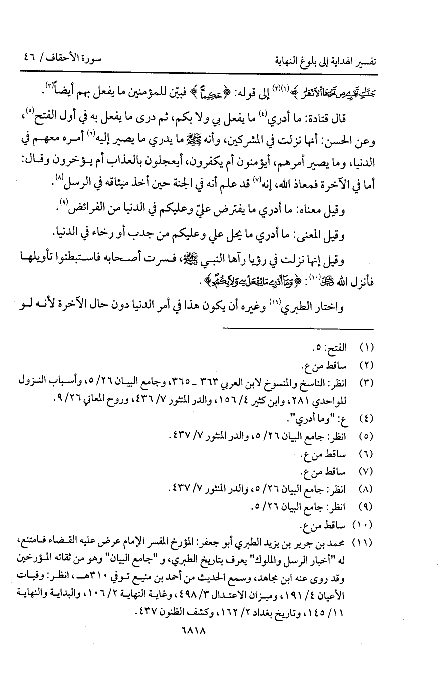 قال قتادة: ما أدري ما يفعل بي ولا بكم، ثم درى ما يفعل به في أول الفتح، وعن الحسن: أنها نزلت في المشركين، وأنه A ما يدري ما يصير إليه أمره معهم في الدنيا، وما يصير أمرهم، أيؤمنون أم يكفرون، أيعجلون بالعذاب أم يؤخرون وقال: أما في الآخرة فمعاذ الله، إنه قد علم أنه في الجنة حين أخذ ميثاقه في الرسل.
