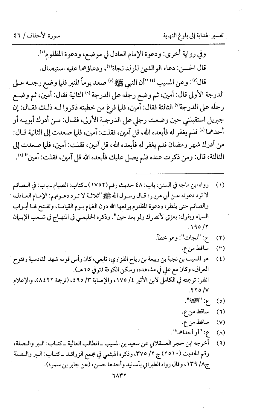 قال: وعن المسيب " أن النبي A صعد يوماً المنبر فلما وضع رجله على الدرجة الأولى قال: آمين، ثم وضع رجله على الدرجة الثانية فقال: آمين، ثم وضع رجله على الدرجة الثالثة فقال: آمين، فلما فرغ من خطبته ذكروا له ذلك فقال: إن جبريل استقبلني حين وضعت رجلي على الدرجة الأولى، فقال: من أدرك أبويه أو أحدهما فلم يغفر له فأبعده الله، قل آمين، فقلت: آمين، فلما صعدت إلى الثانية قال: من أدرك شهر رمضان فلم يغفر له فأبعده الله، قل آمين، فقلت: آمين، فلما صعدت إلى الثالثة، قال: ومن ذكرت عنده فلم يصل عليك فأبعده الله قل آمين، فقلت: آمين ".