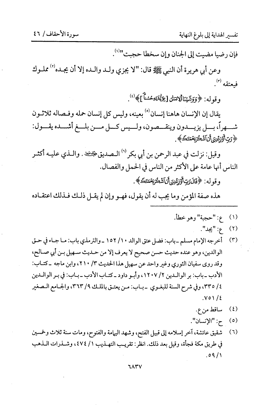 وقيل: نزلت في عبد الرحمن بن أبي بكر الصديق Bهما. والذي عليه أكثر الناس أنها عامة على الأكثر من الناس في الحمل والفصال.