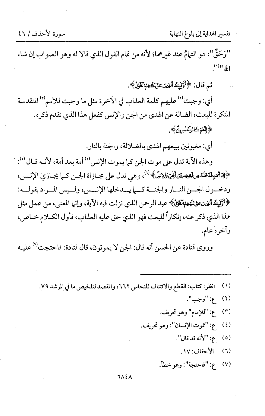 وهذه الآية تدل على موت الجن كما يموت الإنس أمة بعد أمة، لأنه قال: {في أُمَمٍ قَدْ خَلَتْ مِن قَبْلِهِمْ مِّنَ الجن والإنس}، وهي تدل على مجازاة الجن كما يجازي الإنس، ودخول الجن النار والجنة كما يدخلها الإنس، وليس المراد بقوله: {أولئك الذين حَقَّ عَلَيْهِمُ القول} عبد الرحمن الذي نزلت فيه الآية، وإنما المعنى، من عمل مثل هذا الذي ذكر عنه، إنكاراً للبعث فهو الذي حق عليه العذاب، فأول الكلام خاص، وآخره عام.