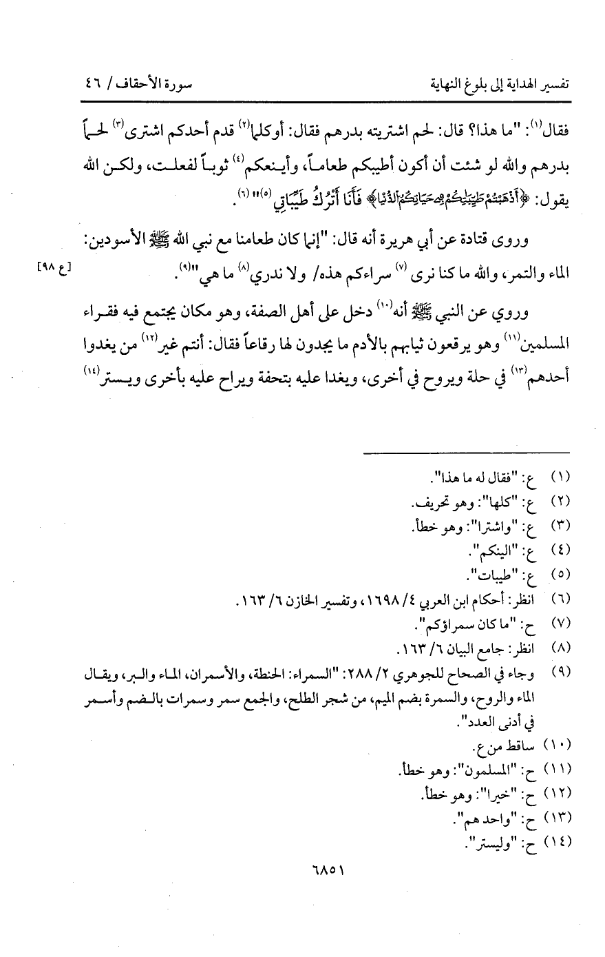 فقال: " ما هذا؟ قال: لحم اشتريته بدرهم فقال: أوكلما قدم أحدكم اشترى لحماً بدرهم والله لو شئت أن أكون أطيبكم طعاماً، وأينعكم ثوباً لفعلت، ولكن الله يقول: {أَذْهَبْتُمْ طيباتكم فِي حَيَاتِكُمُ الدنيا} فَأَنَا أَتْرُكُ طَيِّبَاتِي ".