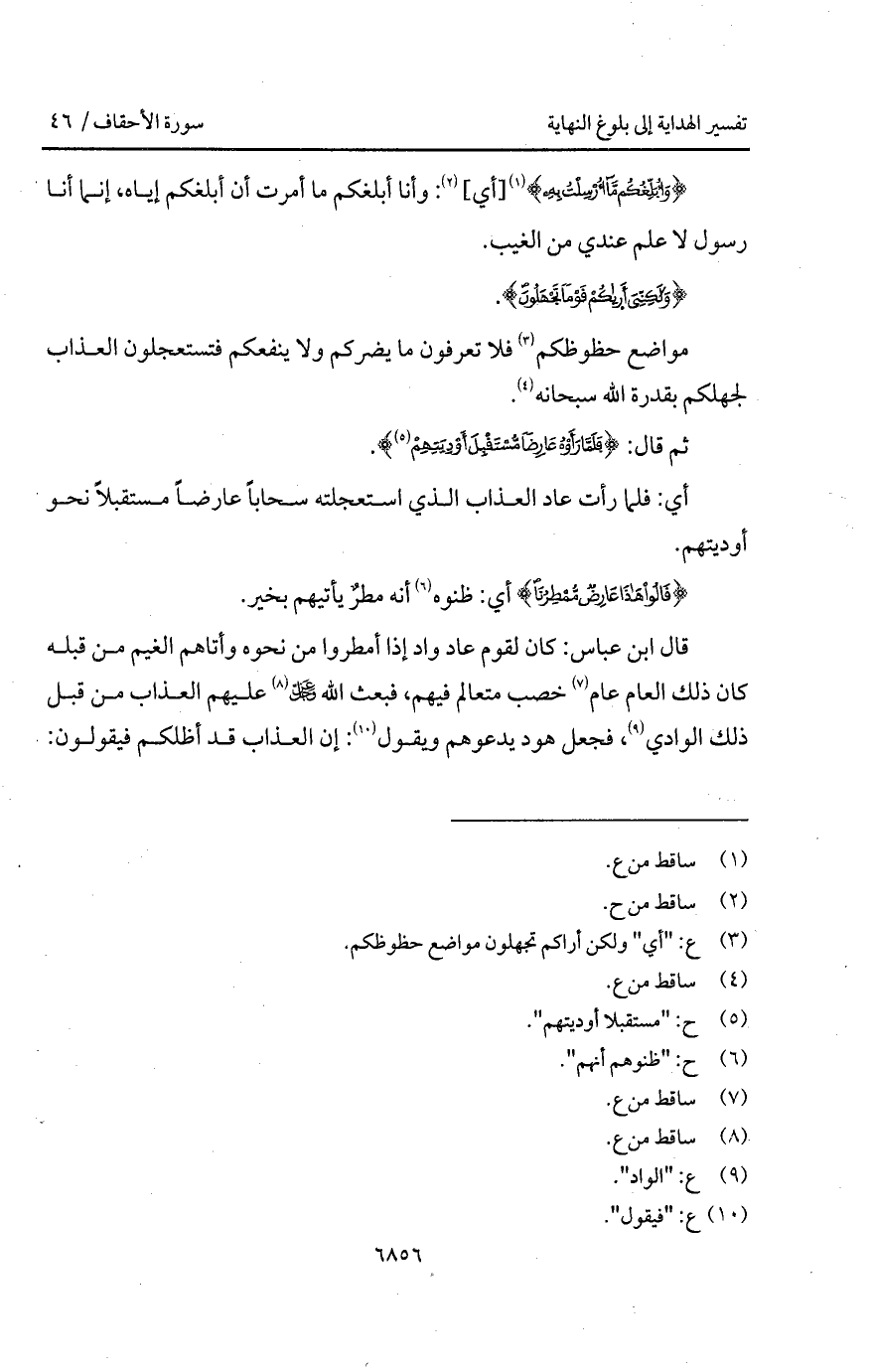 قال ابن عباس: كان لقوم عاد واد إذا أمطروا من نحوه وأتاهم الغيم من قبله كان ذلك العام عام خصب متعالم فيهم، فبعث الله D عليهم العذاب من قبل ذلك الوادي، فجعل هو يدعوهم ويقول: إن العذاب قد أظلكم فيقولون: