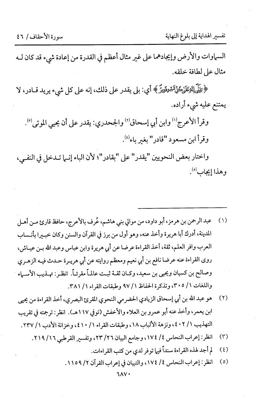 وقرأ الأعرج وابن أبي إسحاق والجحدري: يقدر على أن يحيي الموتى.