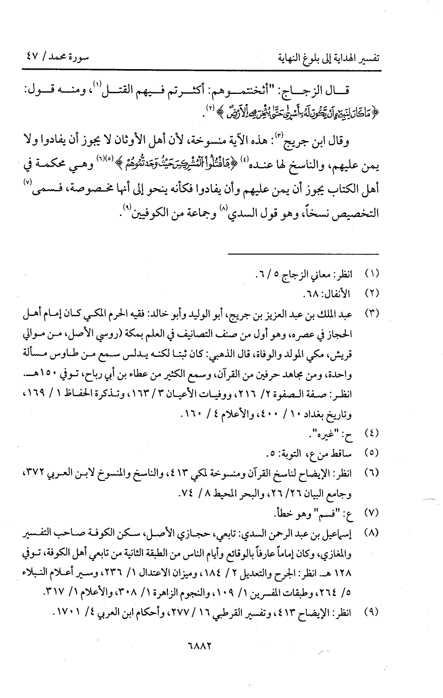 وقال ابن جريج: هذه الآية منسوخة، لأن أهل الأوثان لا يجوز أن يفادوا ولا يمن عليهم، والناسخ لها عنده {فاقتلوا المشركين حَيْثُ وَجَدتُّمُوهُمْ} [التوبة: 5] وهي محكمة في أهل الكتاب يجوز أن يمن عليهم وأن يفادوا فكأنه ينحو إلى أنها مخصوصة، فسمى التخصيص نسخاً، وهو قول السدي وجماعة من الكوفيين.