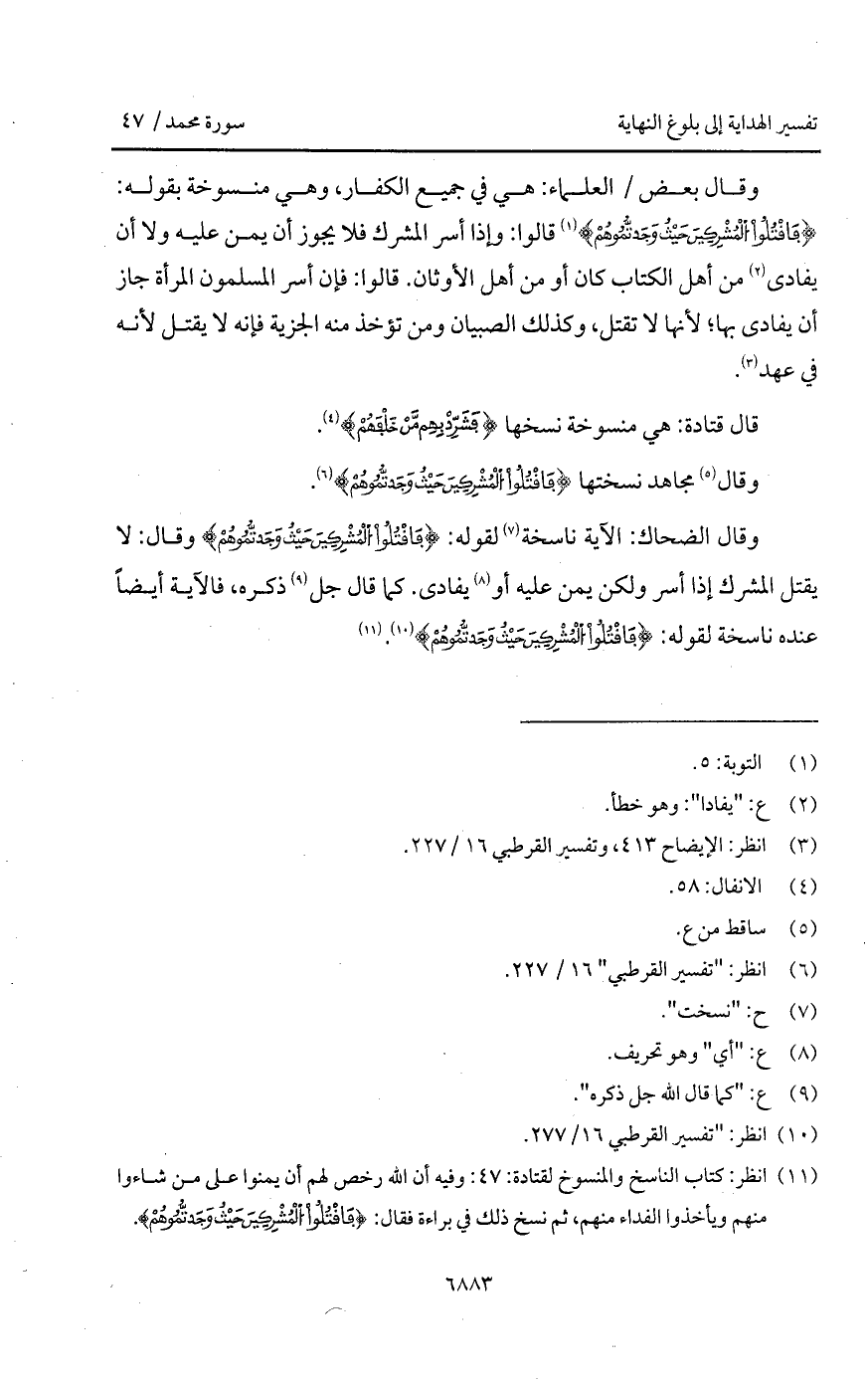 وقال بعض / العلماء: هي في جميع الكفار، وهي منسوخة بقوله: {فاقتلوا المشركين حَيْثُ وَجَدتُّمُوهُمْ} [التوبة: 5] قالوا: وإذا أسر المشرك فلا يجوز أن يمن عليه ولا أن يفادى من أهل الكتاب كان أو من أهل الأوثان. قالوا: فإن أسر المسلمون المرأة جاز أن يفادى بها؛ لأنه لا تقتل، وكذلك الصبيان ومن تؤخذ منه الجزية فإنه لا يقتل لأنه في عهد.