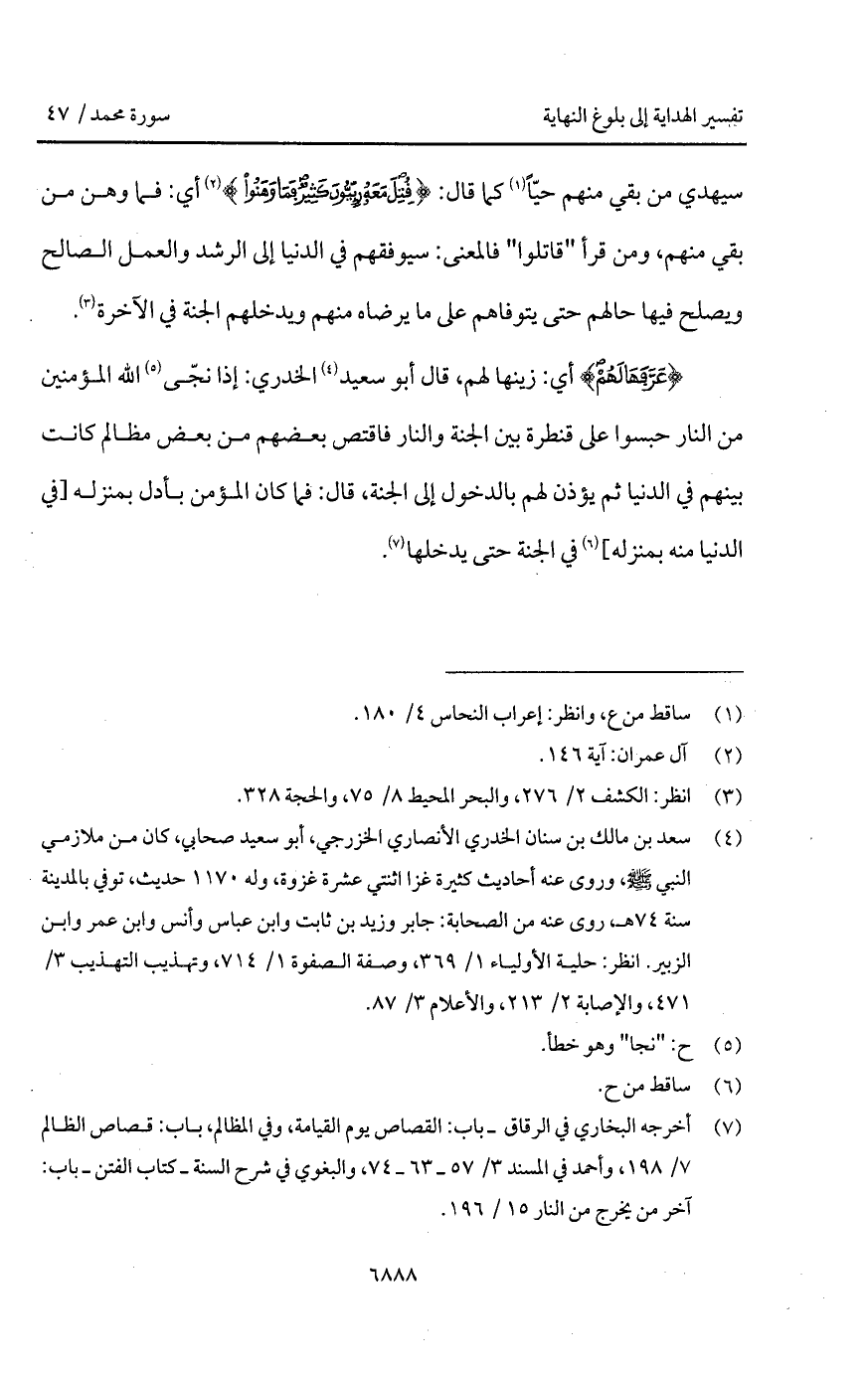 {عَرَّفَهَا لَهُمْ} أي: زينها لهم، قال أبو سعيد الخدري: إذا نجّى الله المؤمنين من النار حبسوا على قنطرة بين الجنة والنار فاقتص بعضهم من بعض مظالم كانت بينهم في الدنيا ثم يؤذن لهم بالدخول إلى الجنة، قال: فما كان المؤمن بأدل بمنزلة [في الدنيا منه بمنزلة] في الجنة حتى يدخلها.