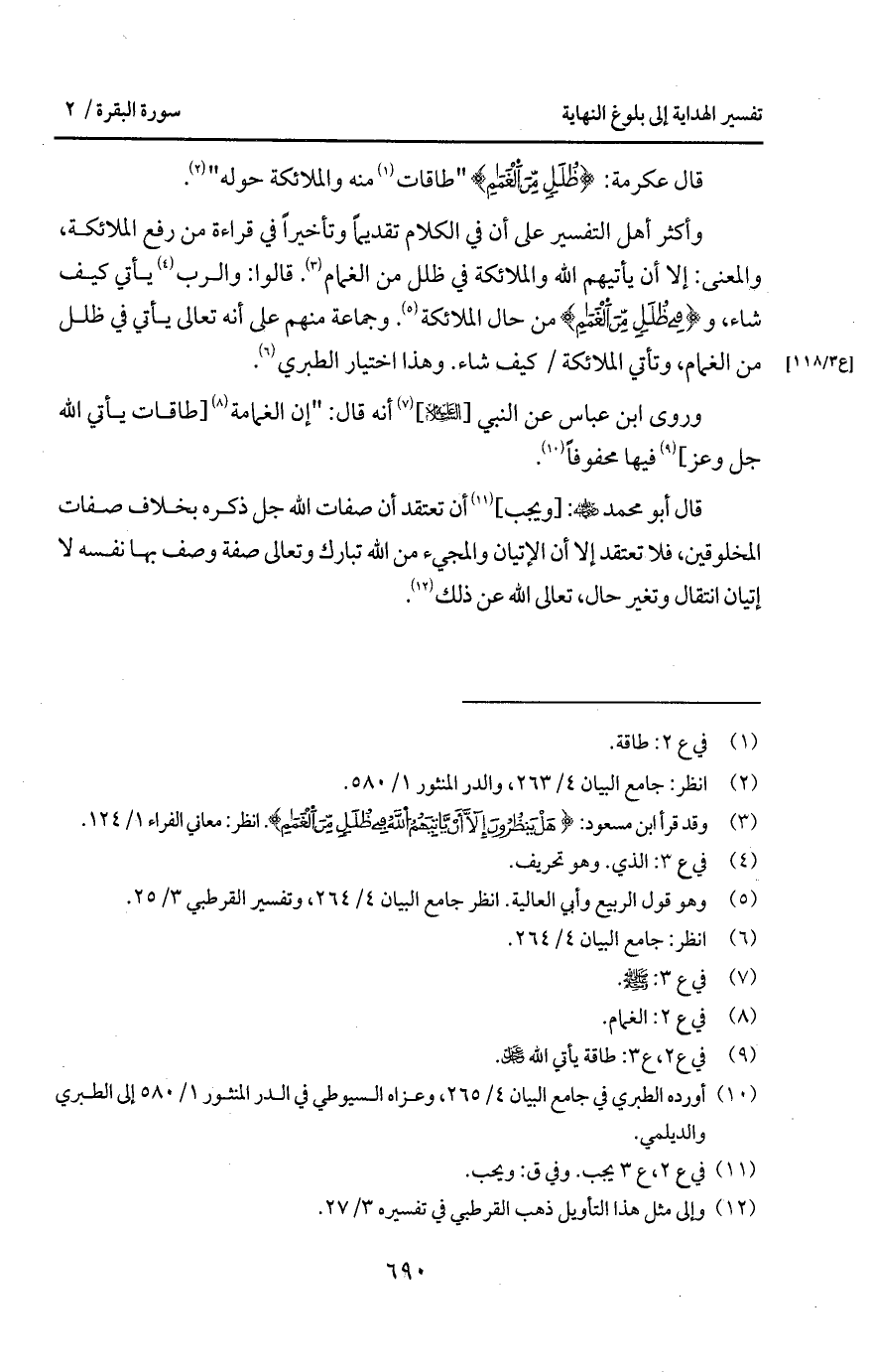 وأكثر أهل التفسير على أن في الكلام تدقديماً وتأخيراً في قراءة من رفع الملائكة، والمعنى: إلا أن يأتيهم الله والملائكة في ظلل من الغمام. قالوا: والرب يأتي كيف شاء، و {فِي ظُلَلٍ مِّنَ الغمام} من حال الملائكة. وجماعة منهم على أنه تعالى يأتي في ظلل من الغمام، وتأتي الملائكة/ كيف شاء. وهذا اختيار الطبري.