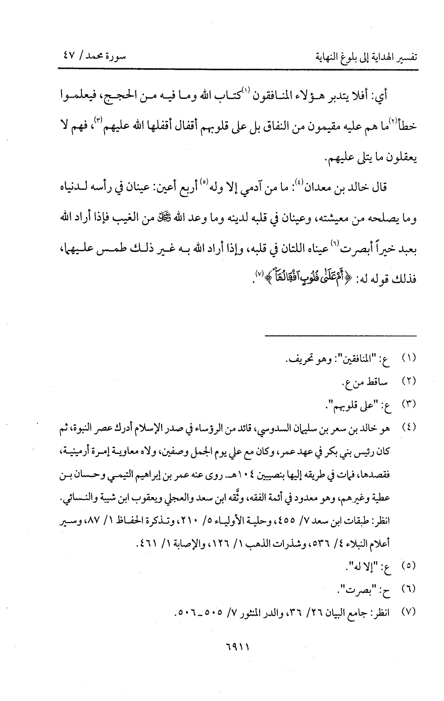 قال خالد بن معدان: ما من آدمي إلا وله أربع أعين: عينان في رأسه لدنياه وما يصلحه من معيشته، وعينان في قلبه لدينه وما وعد الله D من الغيب فإذا أراد الله بعبد خيراً أبصرت عيناه اللتان في قلبه، وإذا أراد الله به غير ذلك طمس عليهما، فذلك قوله له: {أَمْ على قُلُوبٍ أَقْفَالُهَآ}.