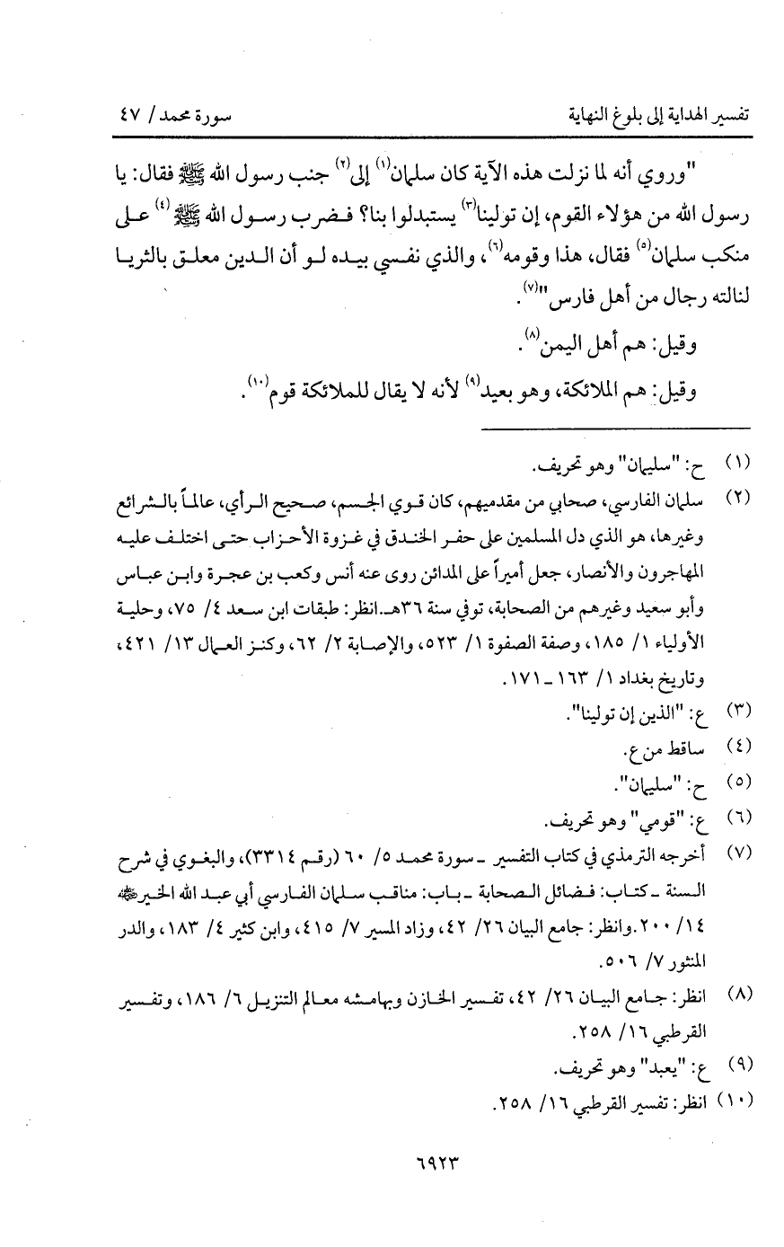" وروي أنه لما نزلت هذه الآية كان سلمان إلى جنب رسول الله A فقال: يا رسول الله من هؤلاء القوم، إن تولينا يستبدلوا بنا؟ فضرب رسول الله A على منكب سلمان فقال، هذا وقومه، والذي نفسي بيده لو أن الدين معلق بالثريا لنالته رجال من أهل فارس ".