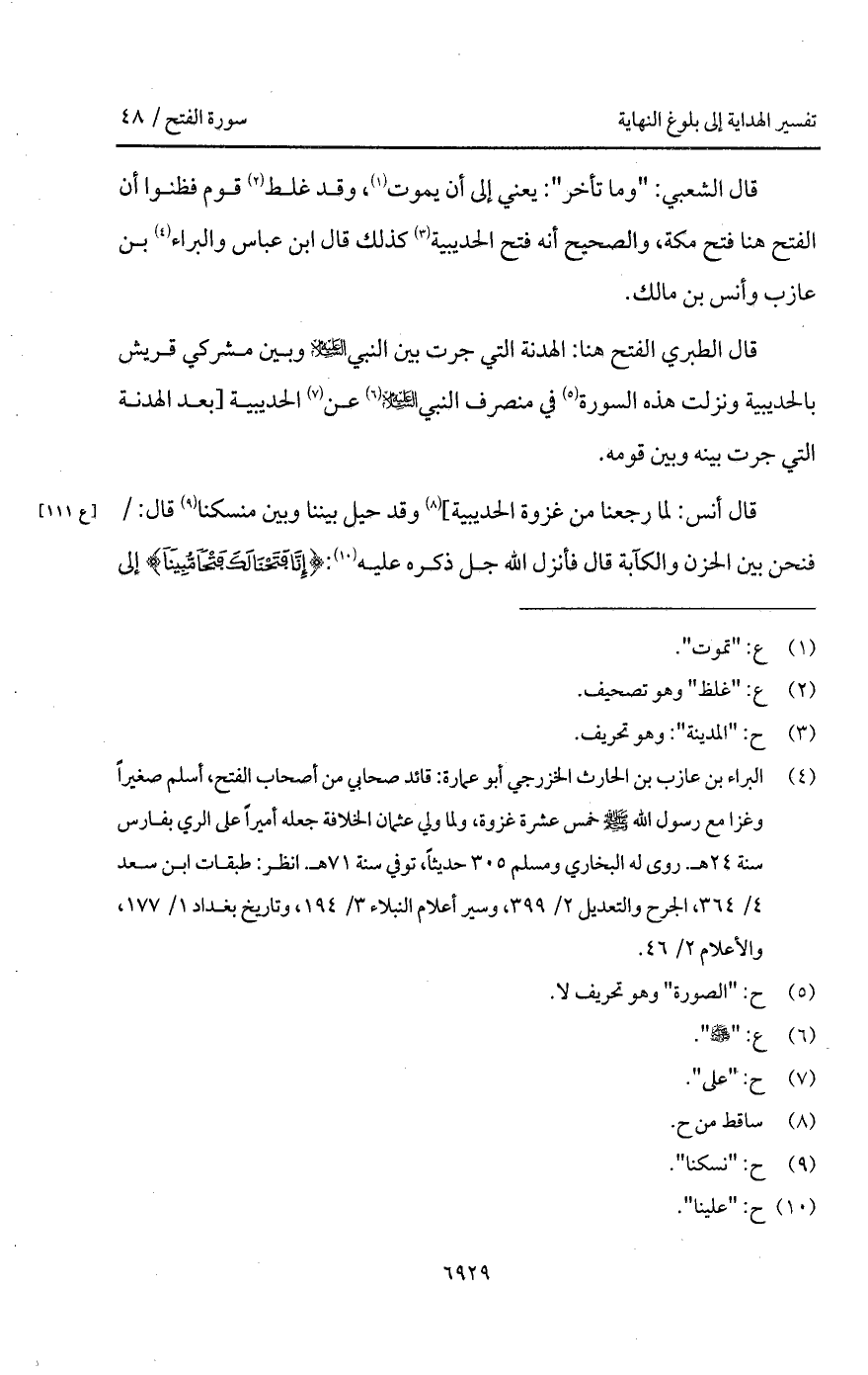 قال أنس: " لما رجعنا ن غزوة الحديبية] وقد حيل بيننا وبين منسكنا قال: / فنحن بين الحزن والكآبة قال فأنزل الله جل ذكره عليه: {إِنَّا فَتَحْنَا لَكَ فَتْحاً مُّبِيناً} إلى