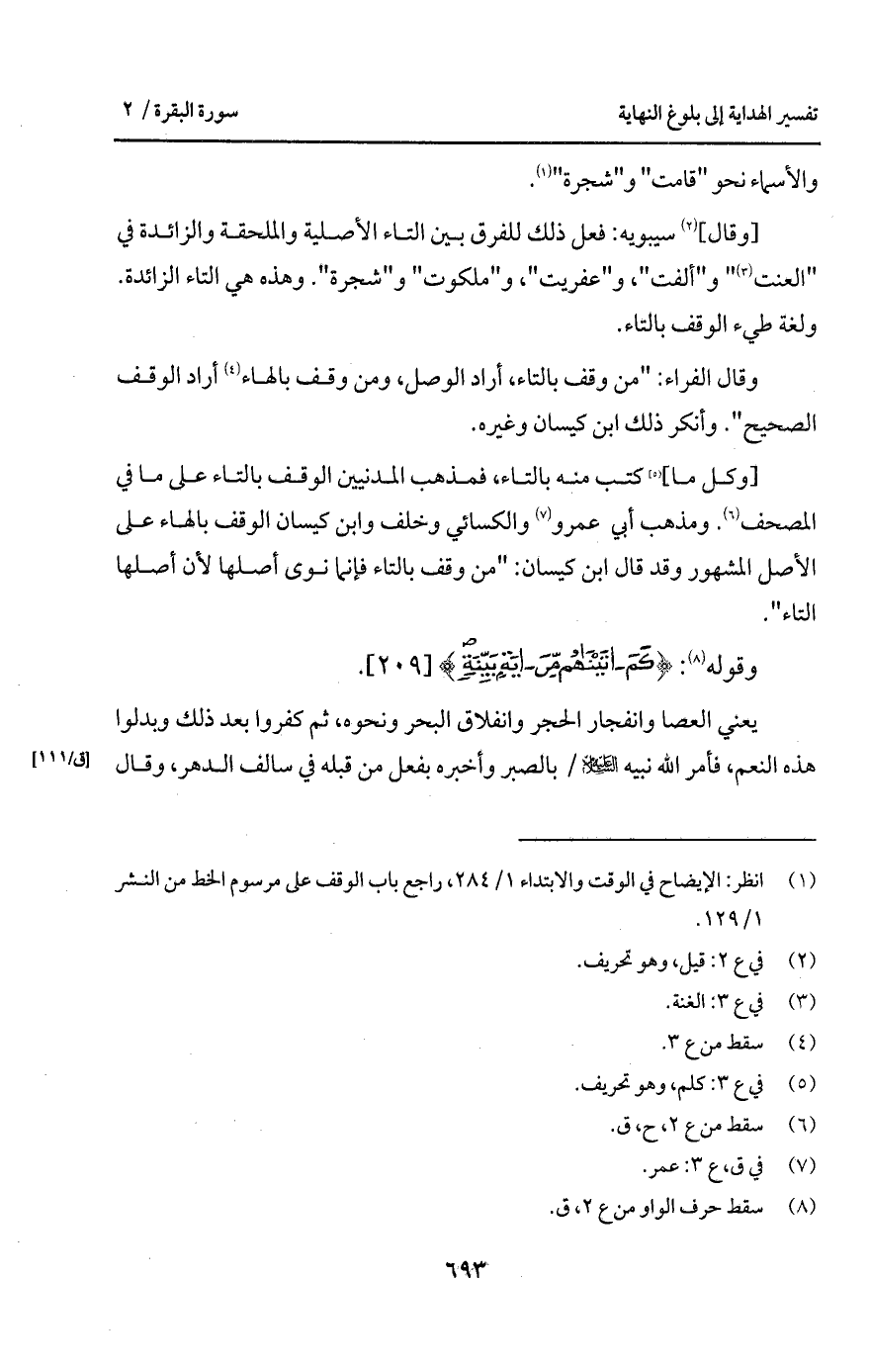[وكل ما] كتب منه بالتاء، فمذهب المدنيين الوقف بالتاء على ما في المصحف. ومذهب أبي عمرو والكسائي وخلف وابن كيسان الوقف بالهاء على الأصل المشهور وقد قال ابن كيسان: " من وقف بالتاء فإنما نوى أصلها لأن أصلها التاء ".
