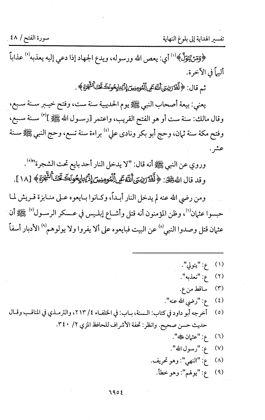 يعني: بيعة أصحاب النبي A يوم الحديبية سنة ست، وفتح خيبر سنة سبع، وقال مالك: سنة ست أو هو الفتح القريب، واعتمر [رسول الله A] سنة سبع، وفتح مكة سنة ثمان، وحج أبو بكر ونادى علي براءة سنة تسع، وحج النبي A سنة عشر.