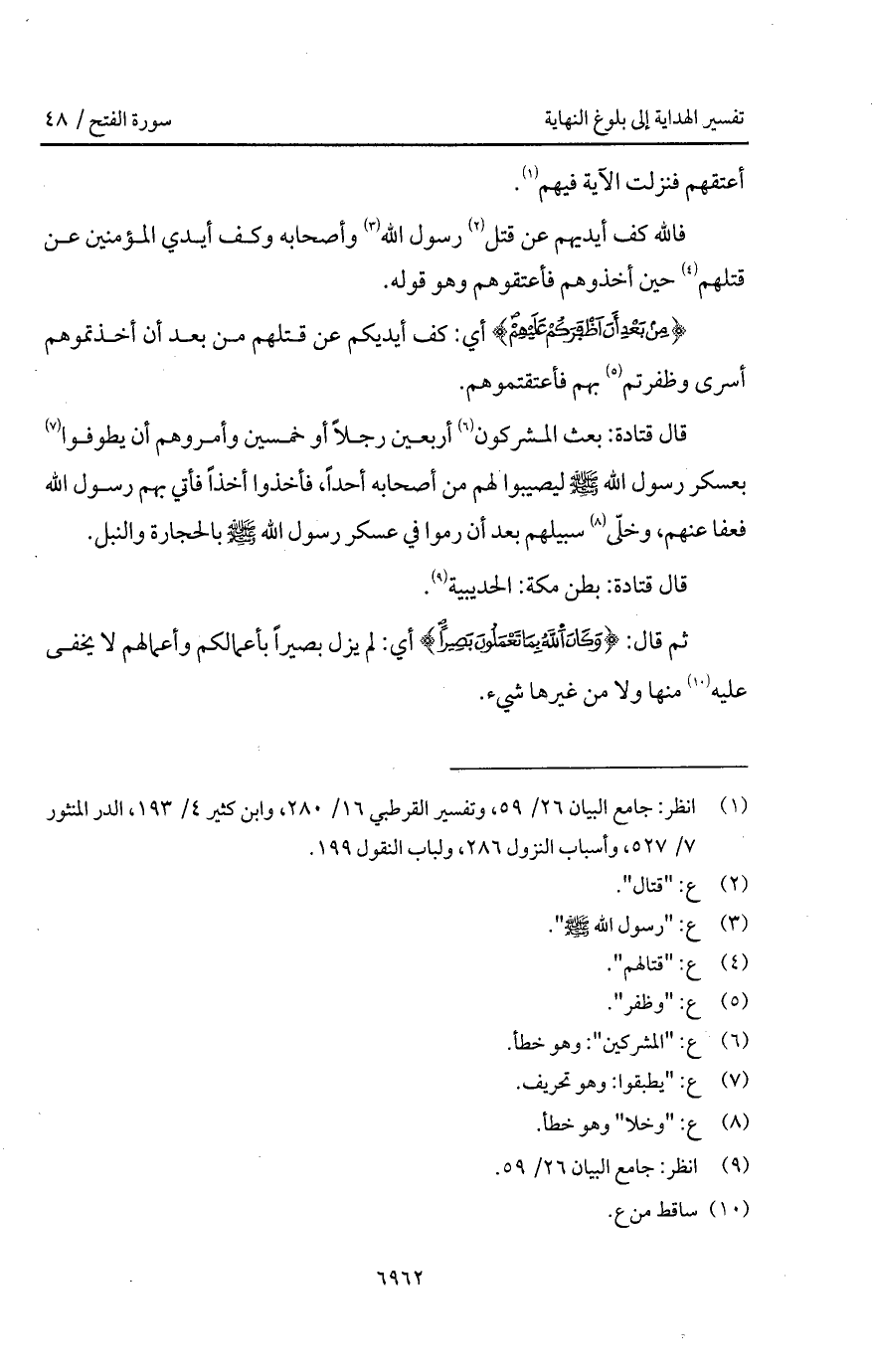 قال قتادة: بعث المشركون أربعين رجلاً أو خمسين وأمروهم أن يطوفوا بعسكر رسول الله A ليصيبوا لهم من أصحابه أحداً، فأخذوا أخذاً فأتي بهم رسول الله فعفا عنهم، وخلّى سبيلهم بعد أن رموا في عسكر رسول الله A بالحجارة والنبل.