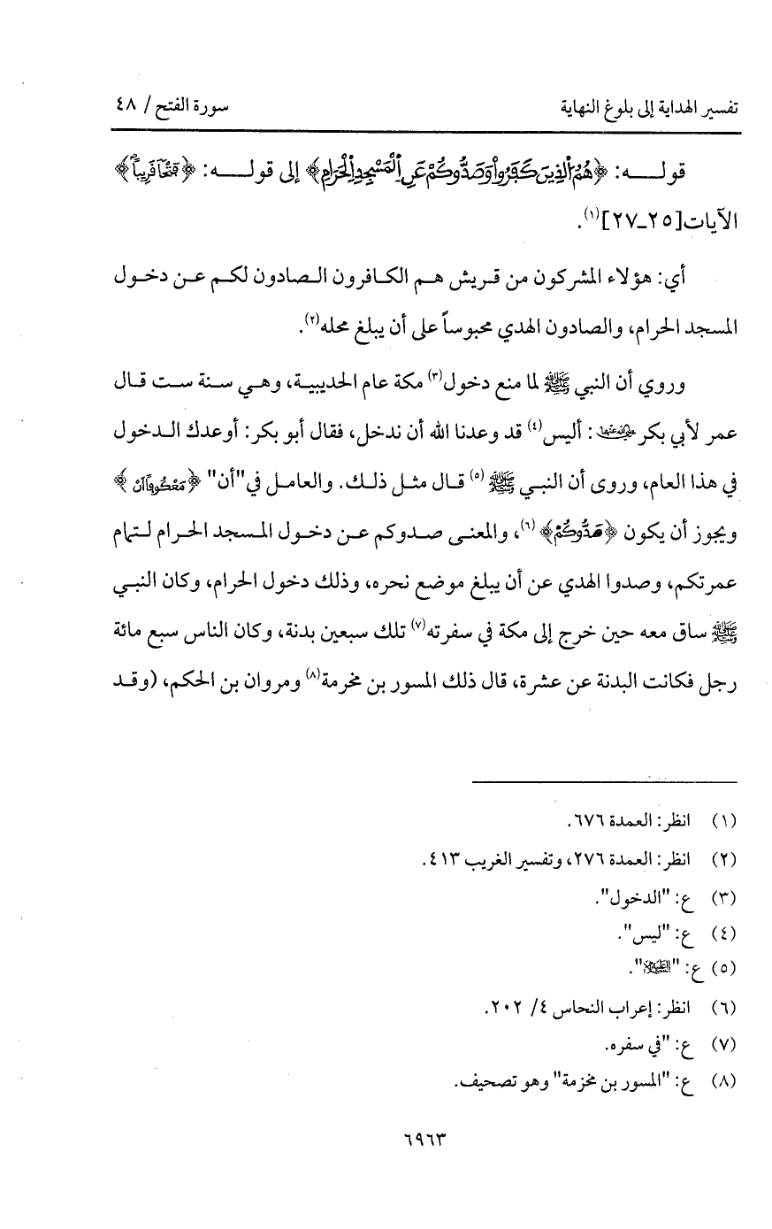 وروي أن النبي A لما منع دخول مكة عام الحديبية، وهي سنة ست قال عمر لأبي بكر Bهما: أليس قد وعدنا الله أن ندخل، فقال أبو بكر: أوعدك الدخول في هذا العام، وروى أن النبي A قال مثل ذلك. والعامل في " أن " {مَعْكُوفاً أَن} ويجوز أن يكون {صَدُّوكُمْ}، والمعنى صدوكم عن دخول المسجد الحرام لتمام عمرتكم، وصدوا الهدي عن أن يبلغ موضع نحره، وذلك دخول الحرام، وكان النبي A ساق معه حين خرج إلى مكة في سفرته تلك سبعين بدنة، وكان الناس سبع مائة رجل فكانت البدنة عن عشرة، قال ذلك المسور بن مخرمة ومروان بن الحكم، (وقد