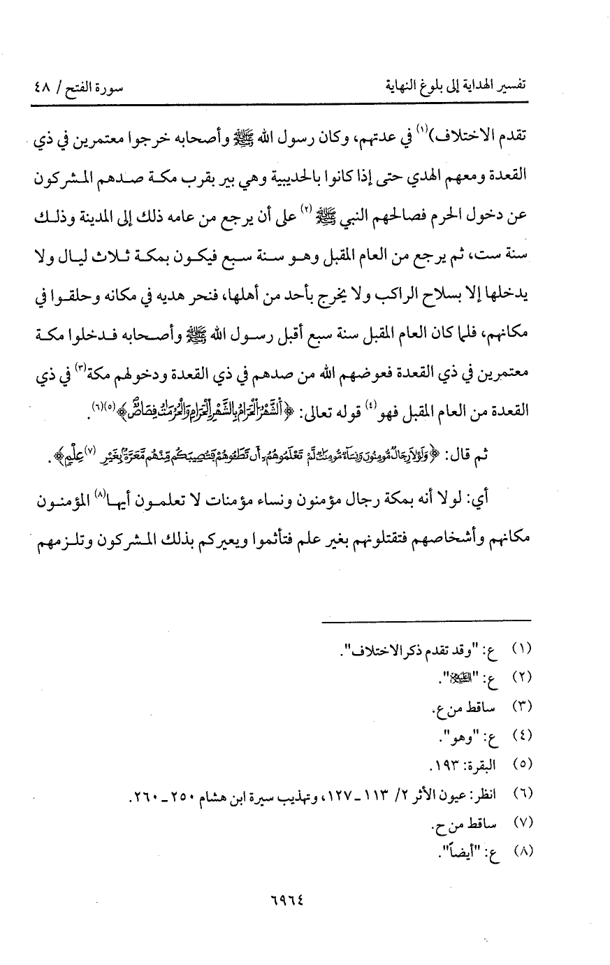 تقدم الاختلاف) في عدتهم، وكان رسول الله A وأصحابه خرجوا معتمرين في ذي القعدة ومعهم الهدي حتى إذا كانوا بالحديبية وهي بير يقرب مكة صدهم المشركون عن دخول الحرم فصالحهم النبي A على أن يرجع من عامه ذلك إلى المدينة وذلك سنة ست، ثم يرجع من العام المقبل وهو سنة سبع فيكون بمكة ثلاث ليال ولا يدخلها إلا بسلاح الراكب ولا يخرج بأحد من أهلها، فنحر هديه في مكانه وحلقوا في مكانهم، فلما كان العام المقبل سنة سبع أقبل رسول الله A وأصحابه فدخلوا مكة معتمرين في ذي القعدة فعوضهم الله من صدهم في ذي القعدة ودخولهم مكة في ذي القعدة من العام المقبل فهو قوله تعالى: {الشهر الحرام بالشهر الحرام والحرمات قِصَاصٌ} [البقرة: 194].