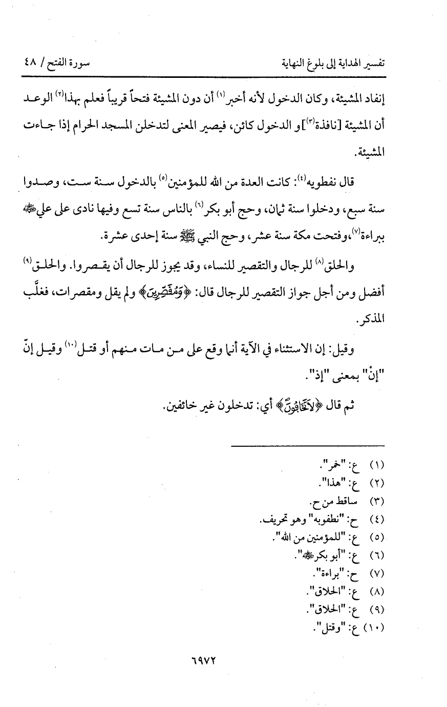 قال نفطويه: كانت العدة من الله للمؤمنين بالدخول سنة ست، وصدوا سنة سبع، ودخلوا سنة ثمان، وحج أبو بكر بالناس سنة تسع وفيها نادى على علي Bهـ ببراءة، وفتحت مكة سنة عشر، وحج النبي A سنة إحدى عشرة.