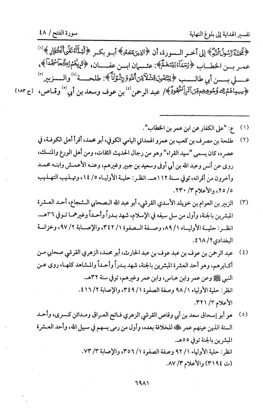 {مُّحَمَّدٌ رَّسُولُ الله} إلى آخر السورة، أن {الذين مَعَهُ} أبو بكر {أَشِدَّآءُ عَلَى الكفار} عمر بن الخطاب {رُحَمَآءُ بَيْنَهُمْ}: عثمان ابن عفان، {تَرَاهُمْ رُكَّعاً سُجَّداً}، علي بن أبي طالب {يَبْتَغُونَ فَضْلاً مِّنَ الله وَرِضْوَاناً}: طلحة والزبير {سِيمَاهُمْ فِي وُجُوهِهِمْ مِّنْ أَثَرِ السجود} / عبد الرحمن بن عوف وسعد بن أبي وقاص،