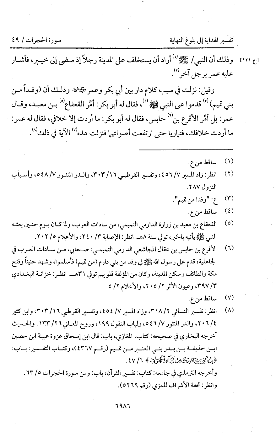 وقيل: نزلت في سبب كلام دار بين أبي بكر وعمر Bهما وذلك أن (وفداً من بني تميم) قدموا على النبي A، فقال له أبو بكر: أمِّر القعقاع بن معبد، وقال عمر: بل أمِّر الأقرع بن حابس، فقال له أبو بكر: ما أردت إلا خلافي، فقال له عمر: ما أردت خلافك، فتماريا حتى ارتفعت أصواتهما فنزلت هذه الآية في ذلك.