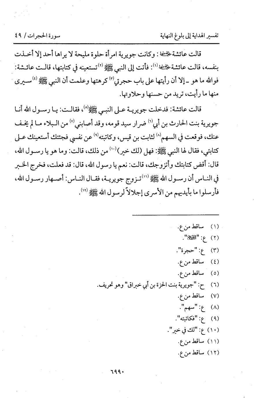 قالت عائشة Bها: وكانت جويرية امرأة حلوة مليحة لا يراها أحد إلا أخذت بنفسه، قالت عائشة Bها: فأتت إلى النبي A تستعينه في كتابتها، قالت عائشة: فوالله ما هو - إلا أن رأيتها على باب حجرتي كرهتها وعلمت أن النبي A سيرى منها ما رأيت، تريد من حسنها وحلاوتها.