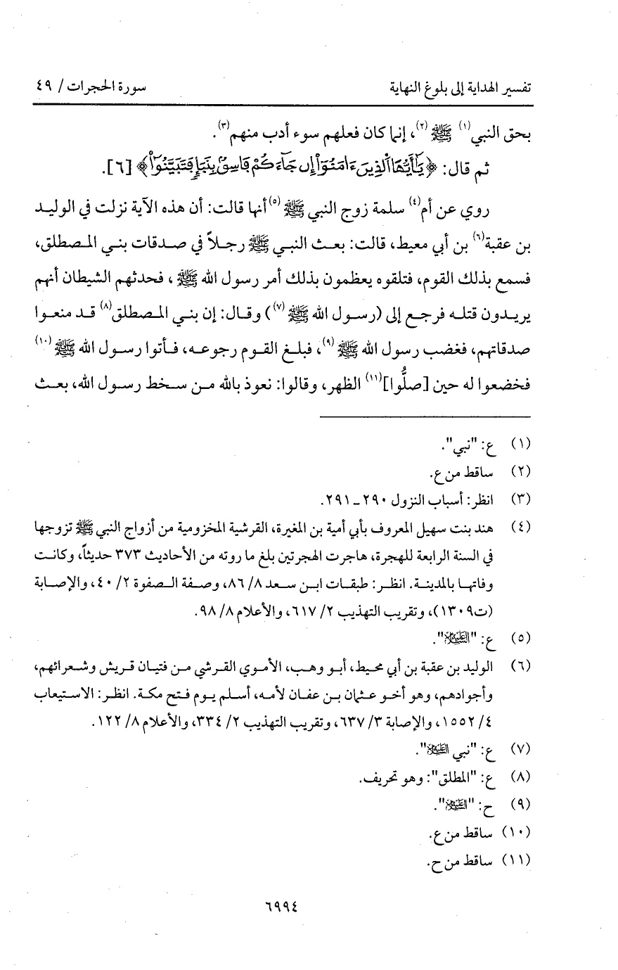 روي عن أم سلمة زوج النبي A أنها قالت: أن هذه الآية نزلت في الوليد بن عقبة بن أبي معيط، قالت: بعث النبي A رجلاً في صدقات بني المصطلق، فسمع بذلك القوم، فتلقوه يعظمون بذلك أمر رسول الله A، فحدثهم الشيطان أنهم يريدون قتله فرجع إلى (رسول الله A) وقال: إن بني المصطلق قد منعوا صدقاتهم، فغضب رسول الله A، فبلغ القوم رجوعه، فأتوا رسول الله A فخضعوا له حين [صلُّوا] الظهر، وقالوا: نعوذ بالله من سخط رسول الله، بعث