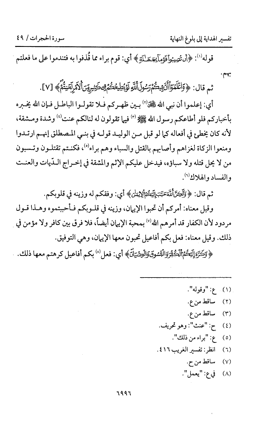 أي: إعلموا أن نبي الله D بين ظهركم فلا تقولوا الباطل فإن الله يخبره بأخباركم فلو أطاعكم رسول الله A فيما تقولون له لنالكم عنت وشدة ومشقة، لأنه كان يخطئ في أفعاله كما لو قبل من الوليد قوله في بني المصطلق إنهم ارتدوا ومنعوا الزكاة لغزاهم وأصابهم بالقتل والسباء وهم براء، فكنتم تقتلون وتسبون من لا يحل قتله ولا سباؤه، فيدخل عليكم الإثم والمشقة في إخراج الدّيات والعنت والفساد والهلاك.