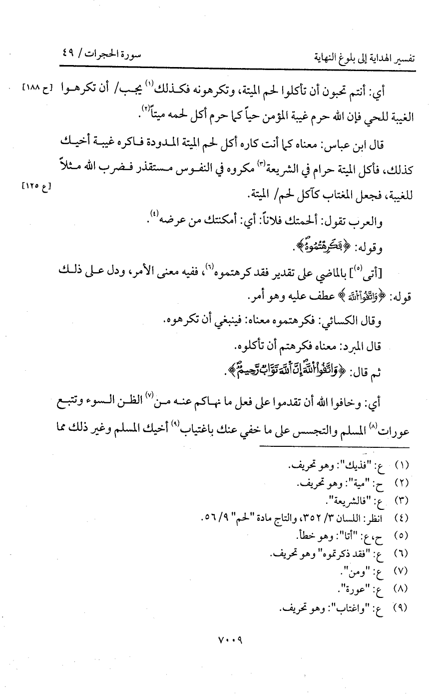 قال ابن عباس: معناه كما أنت كاره أكل لحم الميتة المدودة فاكره غيبة أخيك كذلك، فأكل الميتة حرتم في الشريعة مكروه في النفوس مستقذر فضرب الله مثلاً للغيبة، فجعل المغتاب كآكل لحم / الميتة.